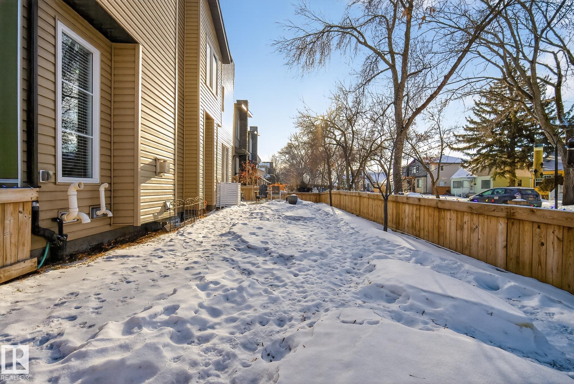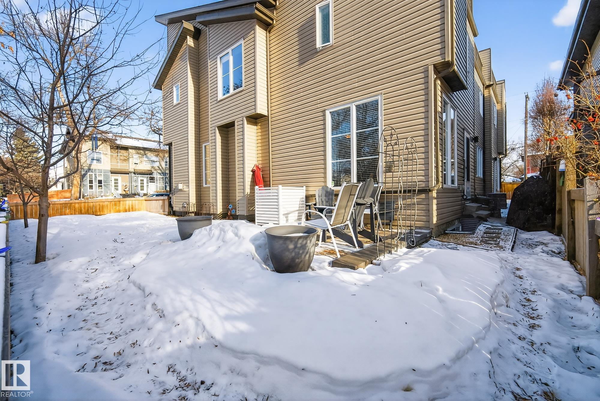 Stylish 2015-built corner unit of triplex in sought-after Bonnie Doon- just steps to Mill Creek Ravine's scenic walking & biking trails. This bright 3-bedroom home offers an open-concept main floor w/chef-inspired kitchen featuring abundant cabinetry, generous counter space & a large island- perfect for gathering. The spacious dining area fits a full family table, while the inviting living room is anchored by a cozy gas fireplace. Upstairs you'll find 3 good-sized bedrooms including a spacious primary retreat with a beautiful 3pc ensuite & upgraded closet by California Closets. A upstairs laundry completes the 2nd floor. ROOF TOP PATIO is your private oasis after a busy day or a place for gardening. Downstairs has 9ft ceilings & is fully finished (2020) with rumpus room, storage, 4pc bath & flex room. CENTRAL AC for warm summer days! Outside, you will love the sunny yard with an exclusive use patio overlooking the tree lined streets. Easy access to the single detached garage. Welcome home!