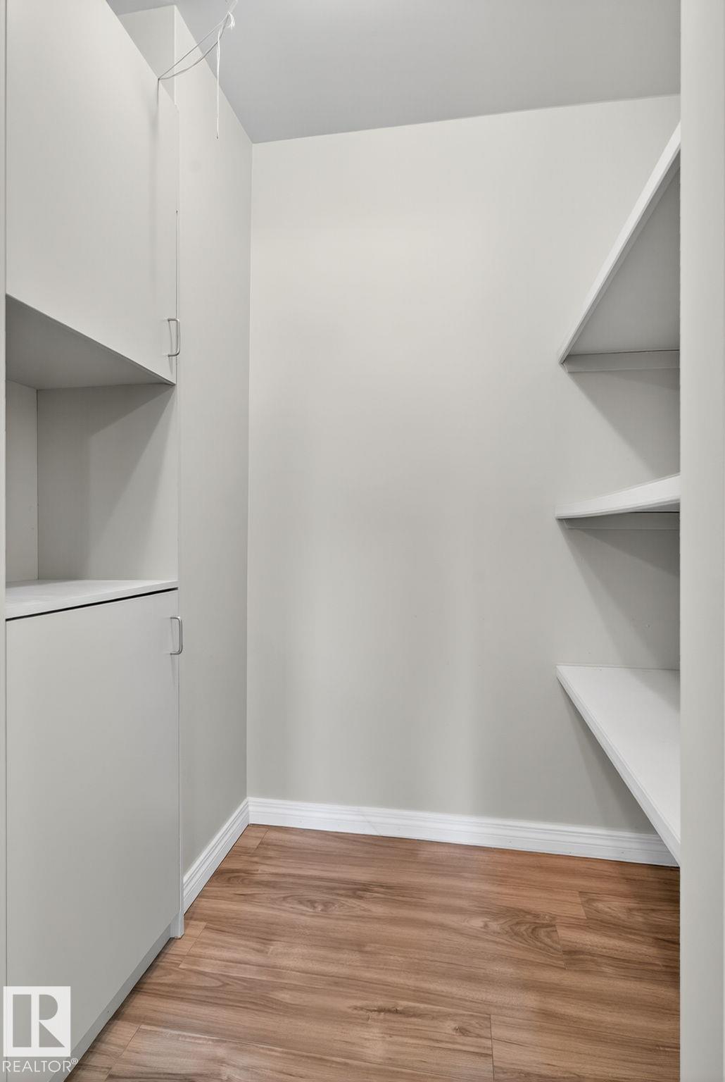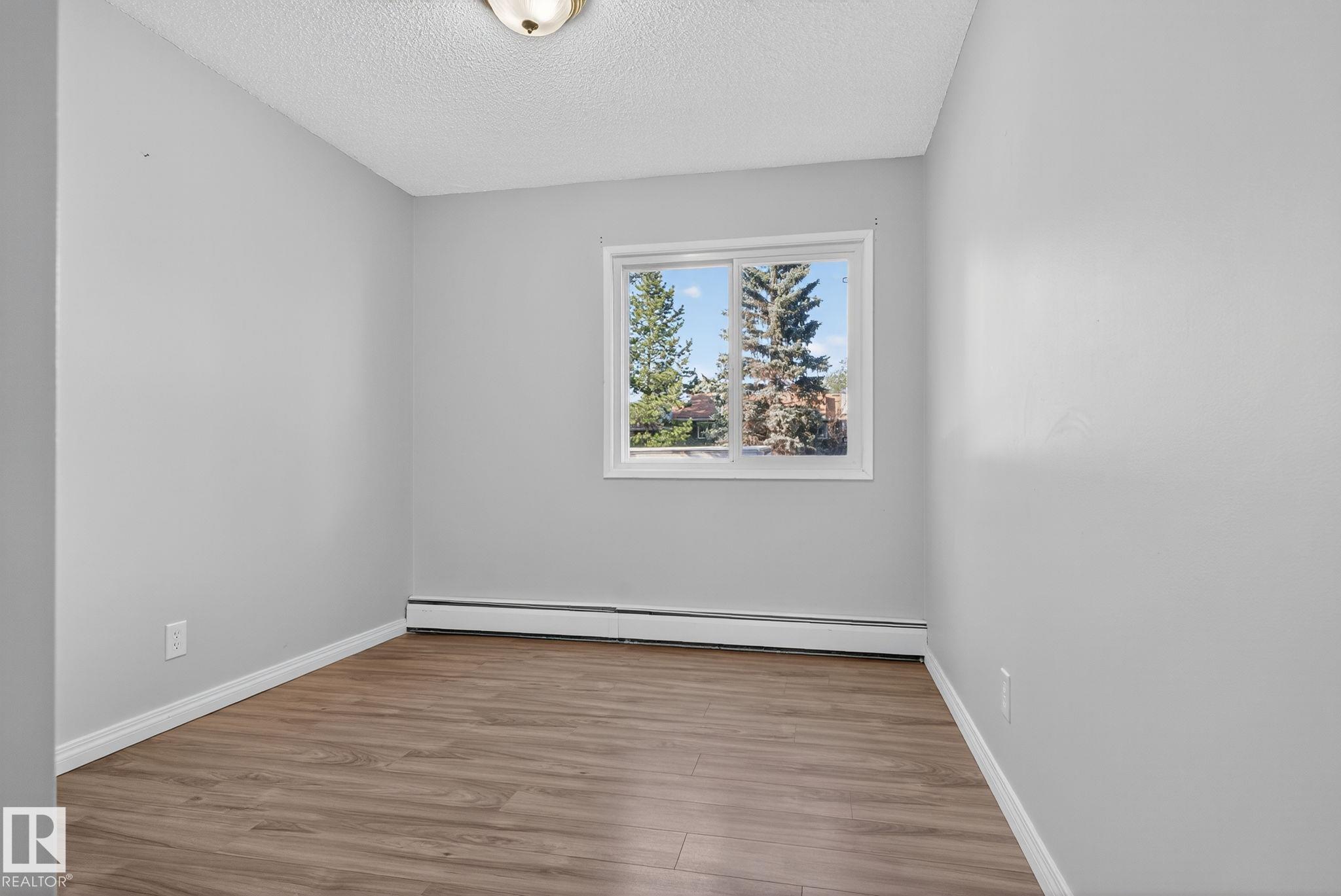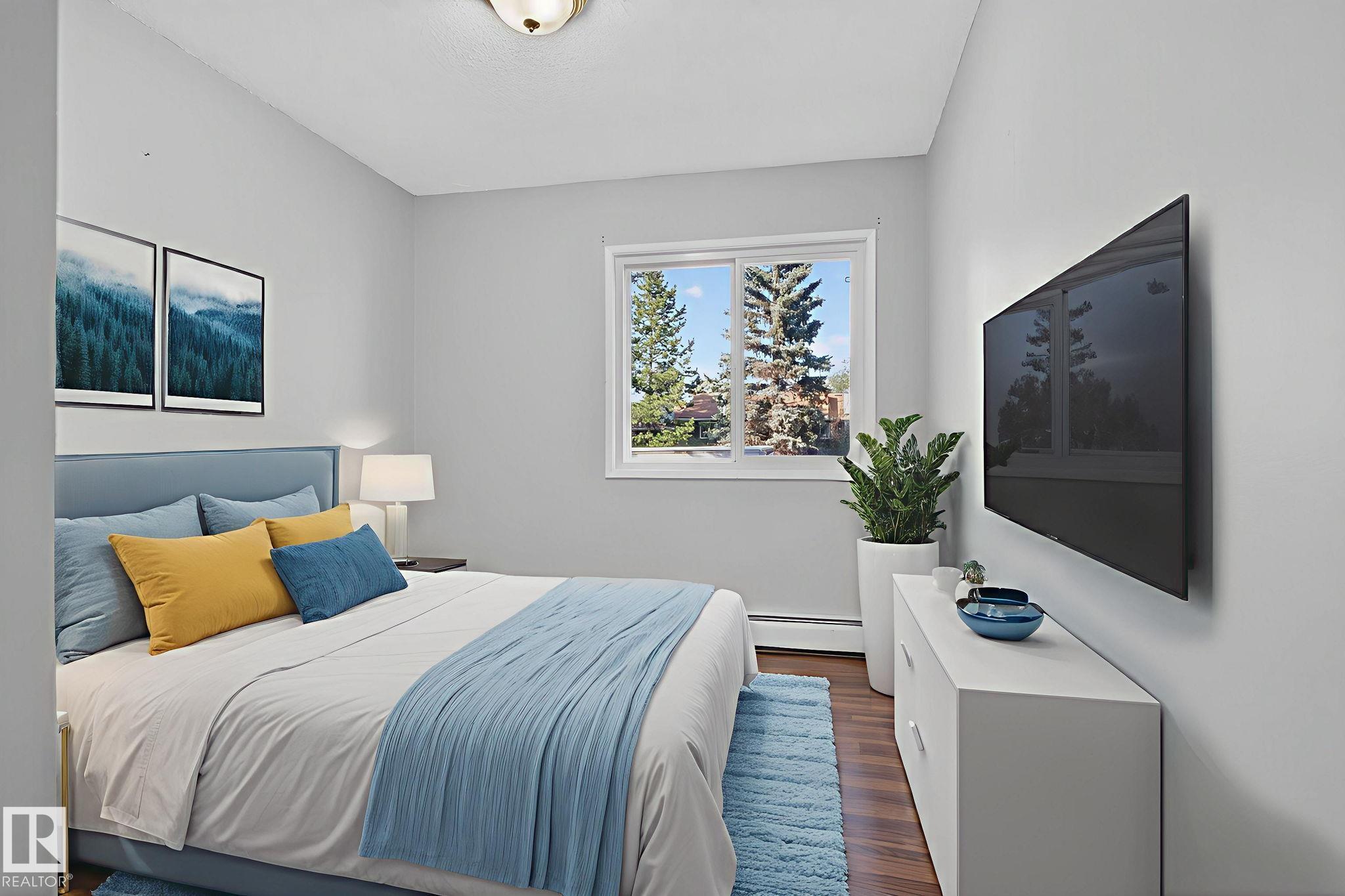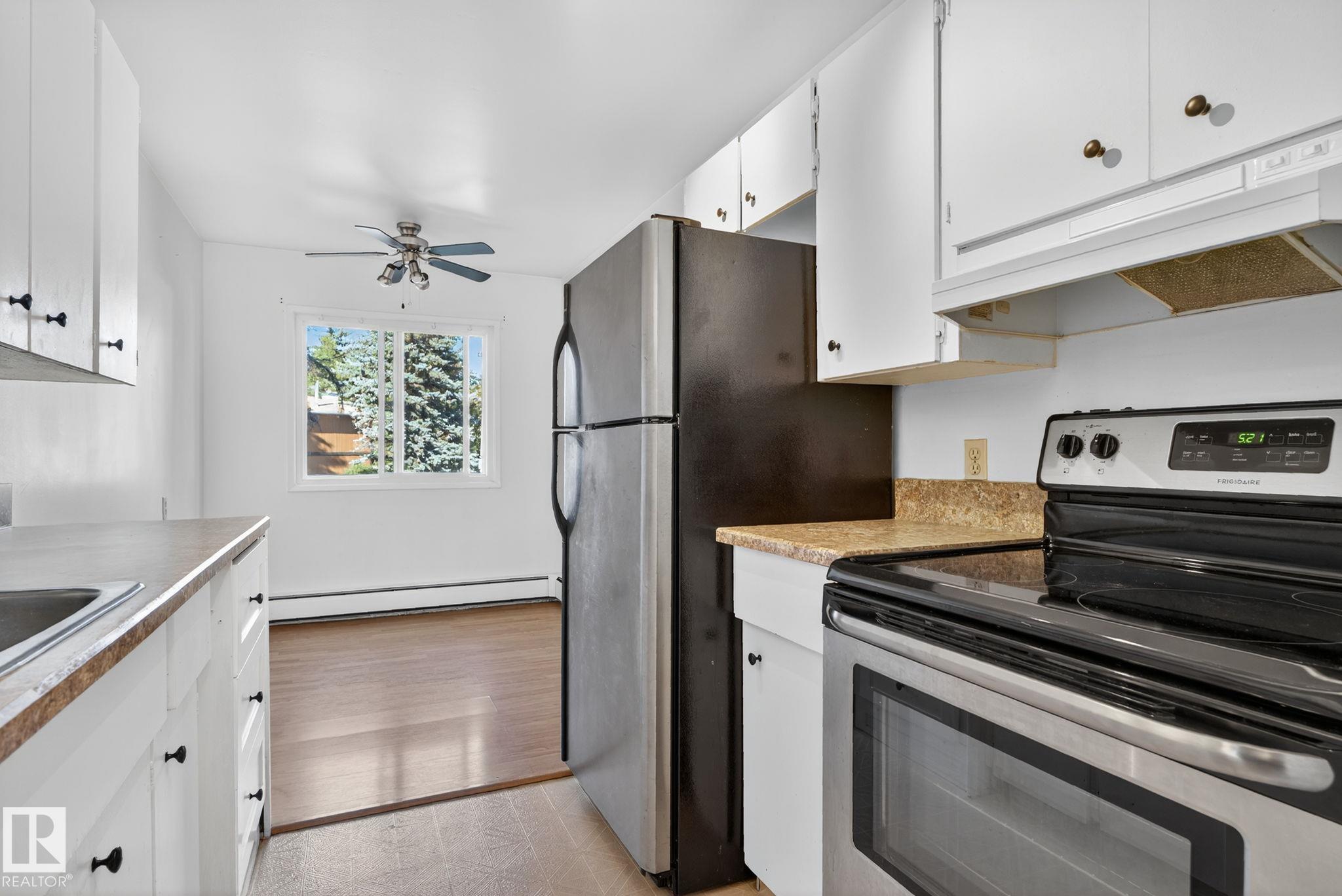 Welcome to a beautifully appointed condo nestled in the heart of the sought-after Brander Gardens community. From the moment you step inside, you're welcomed by a bright galley-style kitchen featuring gleaming stainless steel appliances and timeless white cabinetry, creating a crisp and modern feel. Just beyond, the dining area is bathed in natural light from a large window, setting the stage for intimate meals or lively gatherings. The spacious living room invites you to unwind, with sliding doors leading to your private patio - a perfect spot for morning coffee or evening relaxation. Down the hall, the serene primary bedroom offers a walk-in closet and a peaceful retreat at the end of the day, while a second bedroom, a tastefully upgraded four-piece bathroom, and a generous pantry complete the layout. Surrounded by the natural beauty of the River Valley, with easy access to Terwillegar Dog Park, excellent schools, and Whitemud Drive, this residence combines tranquility with urban convenience.