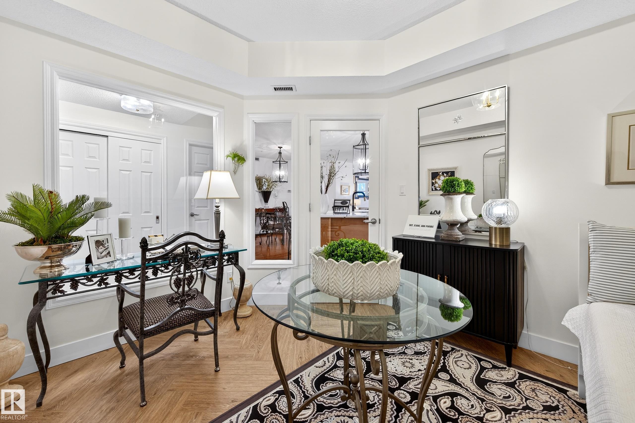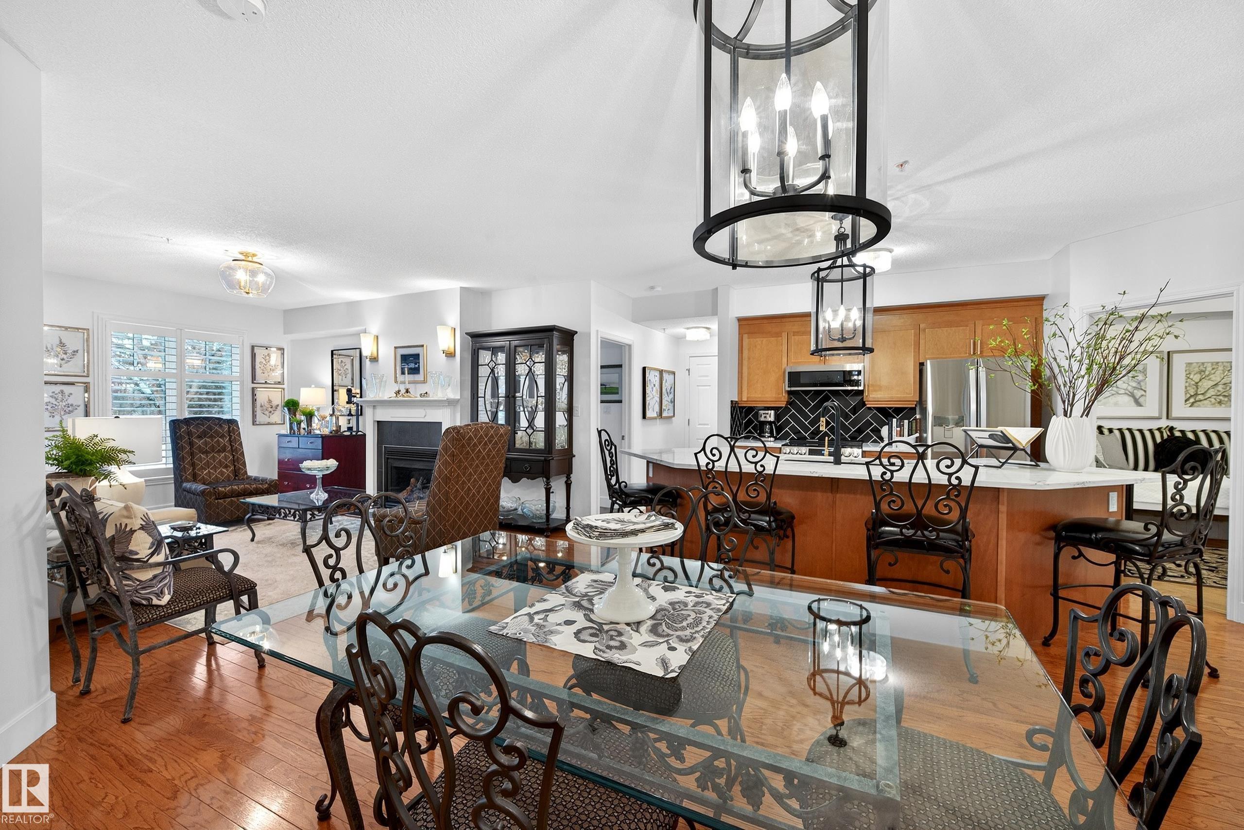 Located in the heart of the River Valley in Cloverdale. This beautifully renovated main floor condo features over 1,294 sq ft with quality upgrades throughout. The spacious primary includes a walk-through closet and 4-pc ensuite, 2nd bedroom is conveniently located next to another 4-pc bath. The updated kitchen is ideal for entertaining with a custom counter-height island, quartz countertops, new backsplash, Blanco Silgranit double sink, and all-new appliances. A versatile den with custom glass French door adds flexible living space. Enjoy hardwood flooring in the main areas, luxury vinyl plank in bedrooms & den, a gas fireplace, and central A/C. Additional upgrades include all new lighting, California knockdown ceilings, baseboards, Hunter Douglas shutters, new washer, dryer. This non-smoking, no-pet home includes titled heated underground parking, secure storage, amenities, condo fees including utilities, & private main-floor patio. Easy access for trails, river valley parks and LRT.