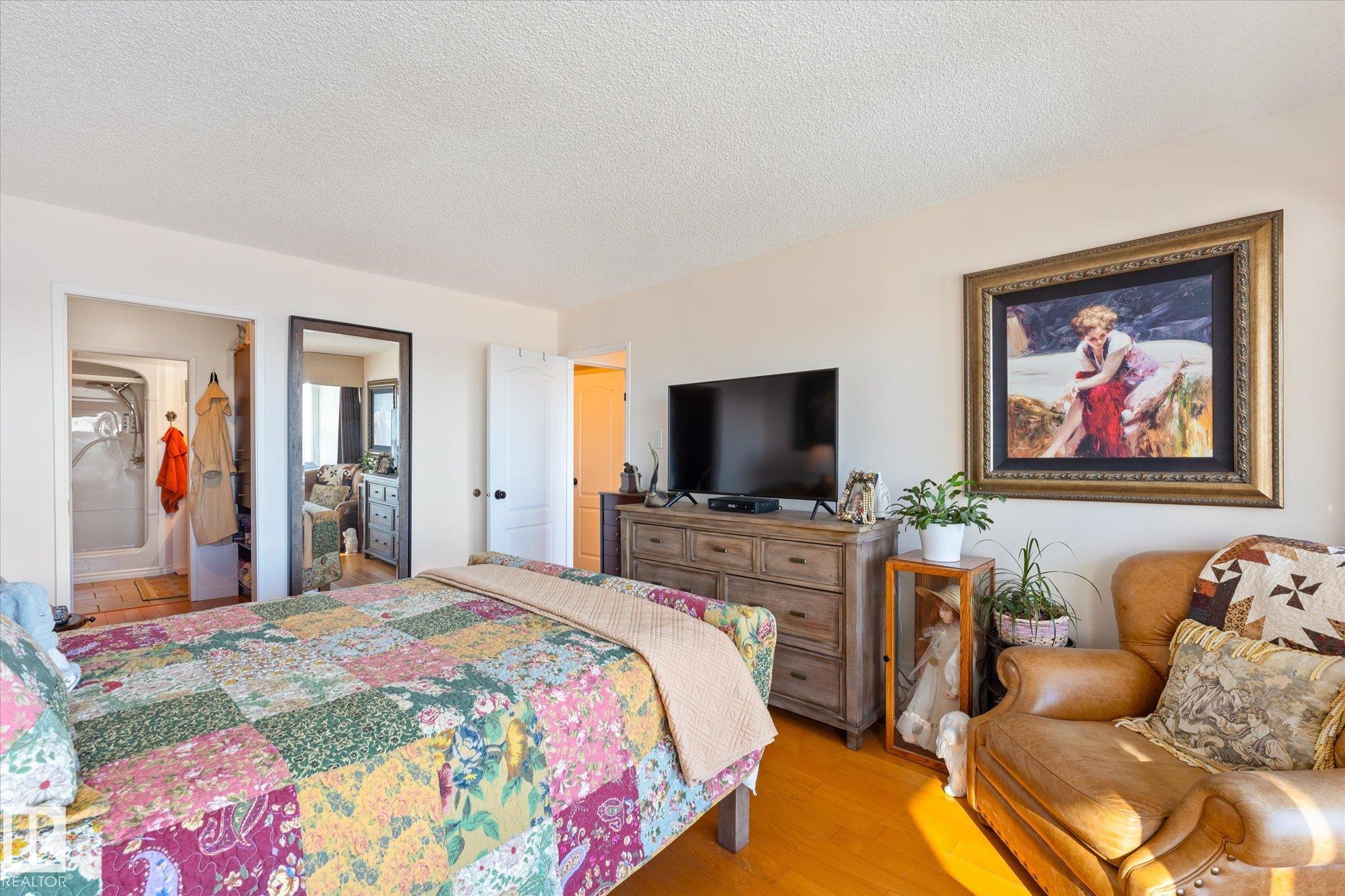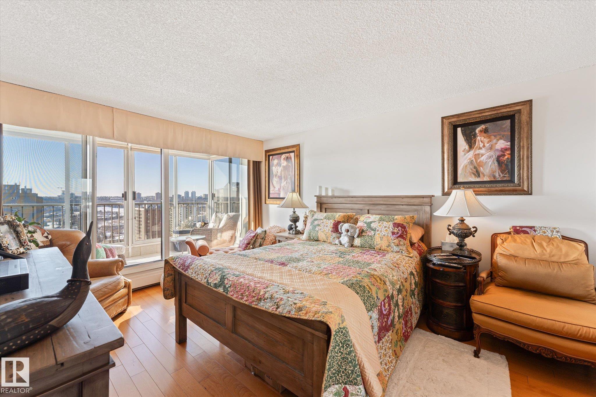 STUNNING RIVER VALLEY VIEW from this RENOVATED 2 bedroom 2 bathroom condo in VALLEY TOWERS conveniently located steps to the river valley, the LRT, Downtown, the Ice District & quick access to the U of A. Beautiful kitchen with custom cabinetry with lots of pull-out drawers, granite countertops, designer skyline glass backsplash, black appliances, concrete wall between the kitchen & dining room. Spacious living room with access to the south facing balcony. The 2nd bedroom is across from the 4 piece bathroom. The primary suite has access to a south facing balcony to enjoy the great views. There is also a walk through closet with closet organizers & an upgraded bathroom with a walk-in shower. Also, there is a laundry/storage room. Titled underground parking #150 & an extra storage locker #24. The condo fees include all utilities, cable TV & the amenities: Fitness room, Indoor Pool, Hot Tub, Sauna, Steam Room, Social Room, an Outdoor Patio with BBQs & Visitor Parking. PETS OKAY: SUBJECT TO BOARD APPROVAL