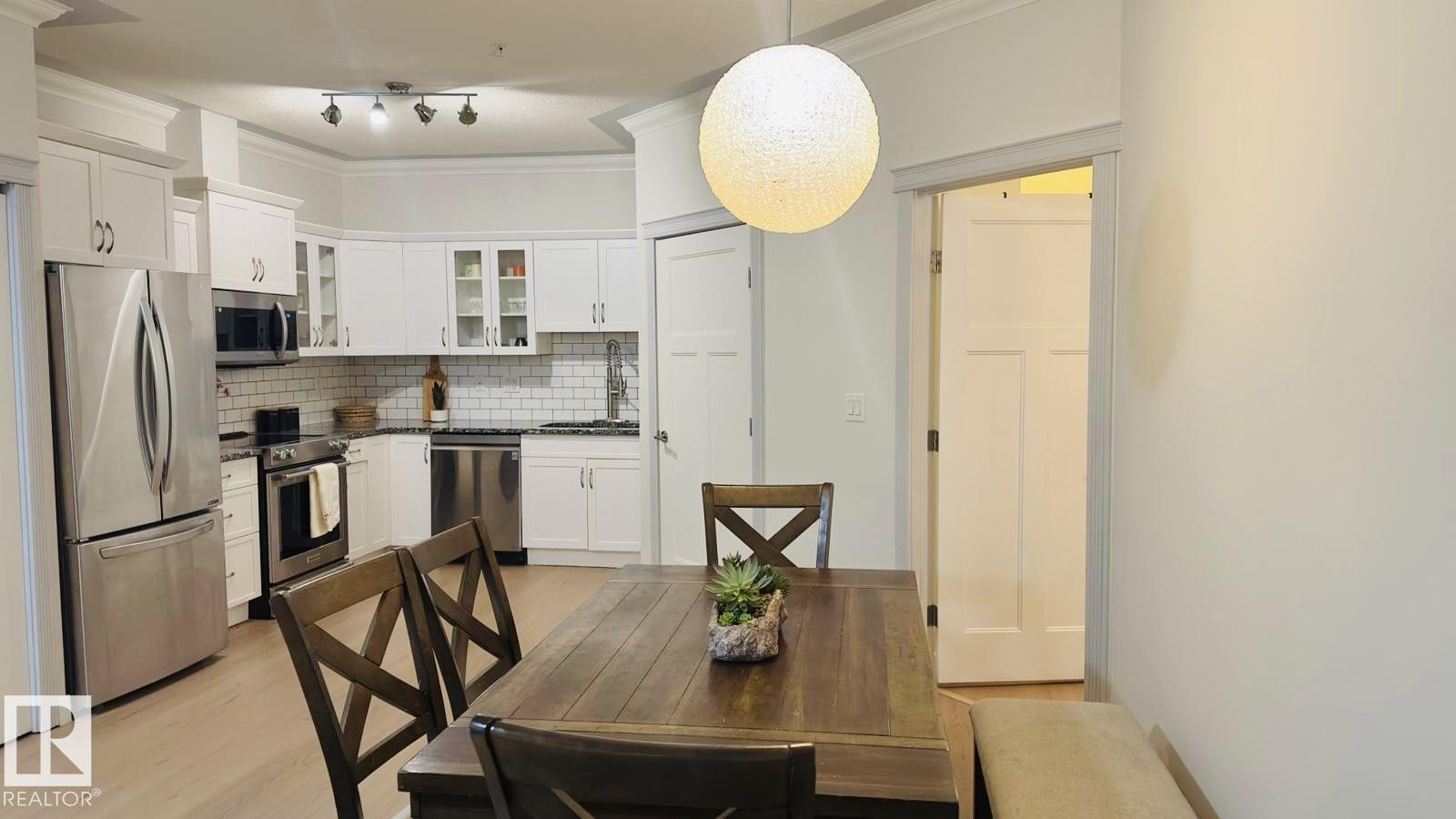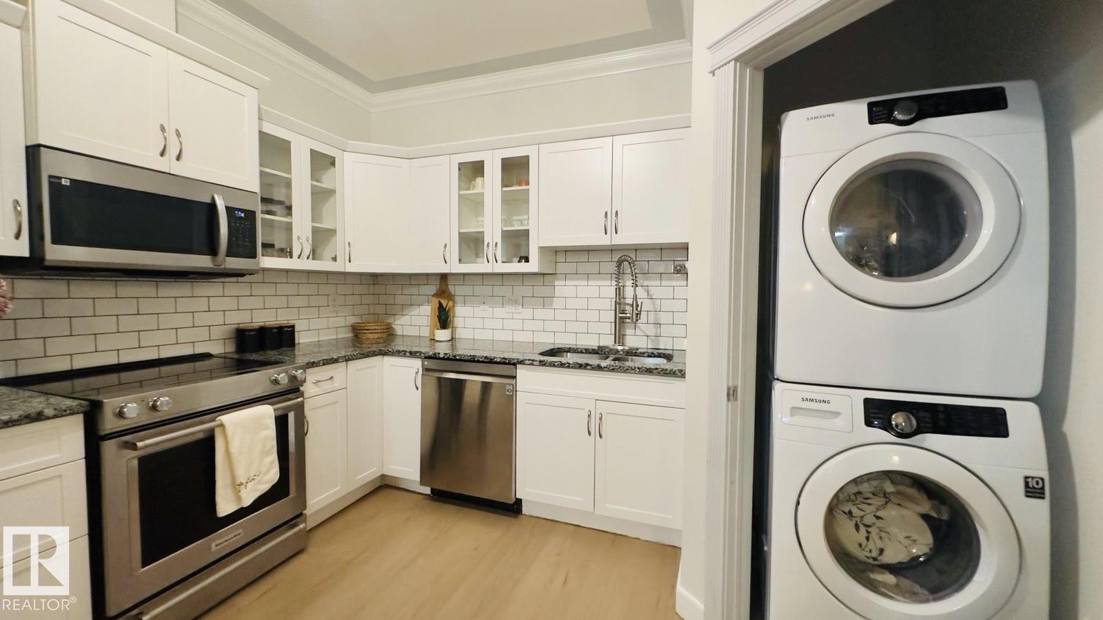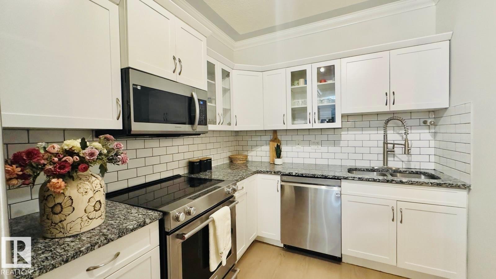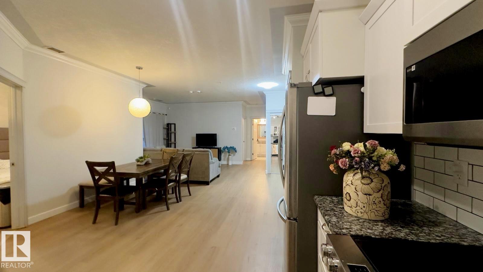 Experience FANTASTIC VALUE in this bright, open-concept 2-bedroom, 2-bathroom ground-floor retreat! The modern kitchen shines with GRANITE COUNTERTOPS, a stylish ceramic backsplash, and premium stainless-steel appliances. Elegance meets function with crown moldings, a spacious living area separating the bedrooms for privacy, and in-suite laundry. Pet owners will love the secure patio door offering direct outdoor access. This well-managed building boasts a fitness center, sauna, social room, and titled underground parking. Nestled in a vibrant Northeast Edmonton hub, you are minutes from the scenic River Valley and Clareview Recreation Centre. Enjoy ultimate convenience with elite shopping at Manning Town Centre and easy access to the LRT system for a seamless commute downtown or to the University. With the Anthony Henday and Manning Freeway nearby, this is a perfect home for starters, students, or investors seeking a turnkey property in a growing community near parks and schools!