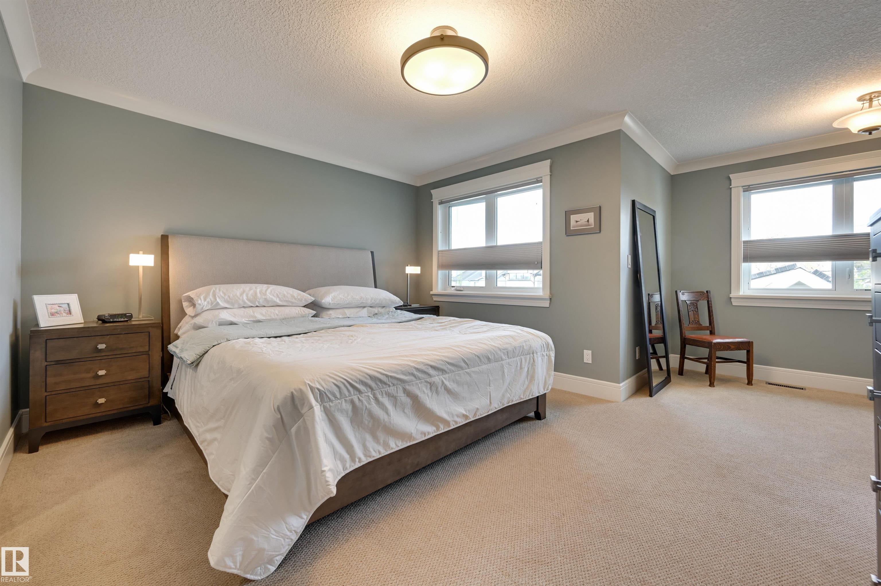 Welcome to this CUSTOM BUILT home! With aprox. 2,700 sq. ft.total living space, this property offers 3 bedrooms and 2.5 baths. The open floor plan is filled with natural light, featuring a modern kitchen,flowing effortlessly into the diningroom with views to the garden and living room enhanced by a cozy fireplace. Primary suite boasts a spa-inspired ensuite with STEAM SHOWER, bonus room w/ access to south balcony. Downstairs, find 2 additional bedrooms,full bath & family room with wet bar--perfect for entertaining.Outdoors, enjoy a private yard enhanced with a bubbler water feature and perennial gardens and patios.A true highlight is the OVERSIZED HEATED DOUBLE GARAGE WITH LARGE LOFT,ideal for workshop, studio or man cave. Energy efficiency shines with SOLAR PANELS.Set on a 4,300+ sq. ft. lot and located minutes from the University of Alberta, Whyte Avenue, downtown, and the river valley, this home combines style, function, and convenience. A true Queen Alexandra gem--move-in ready and designed to impress!