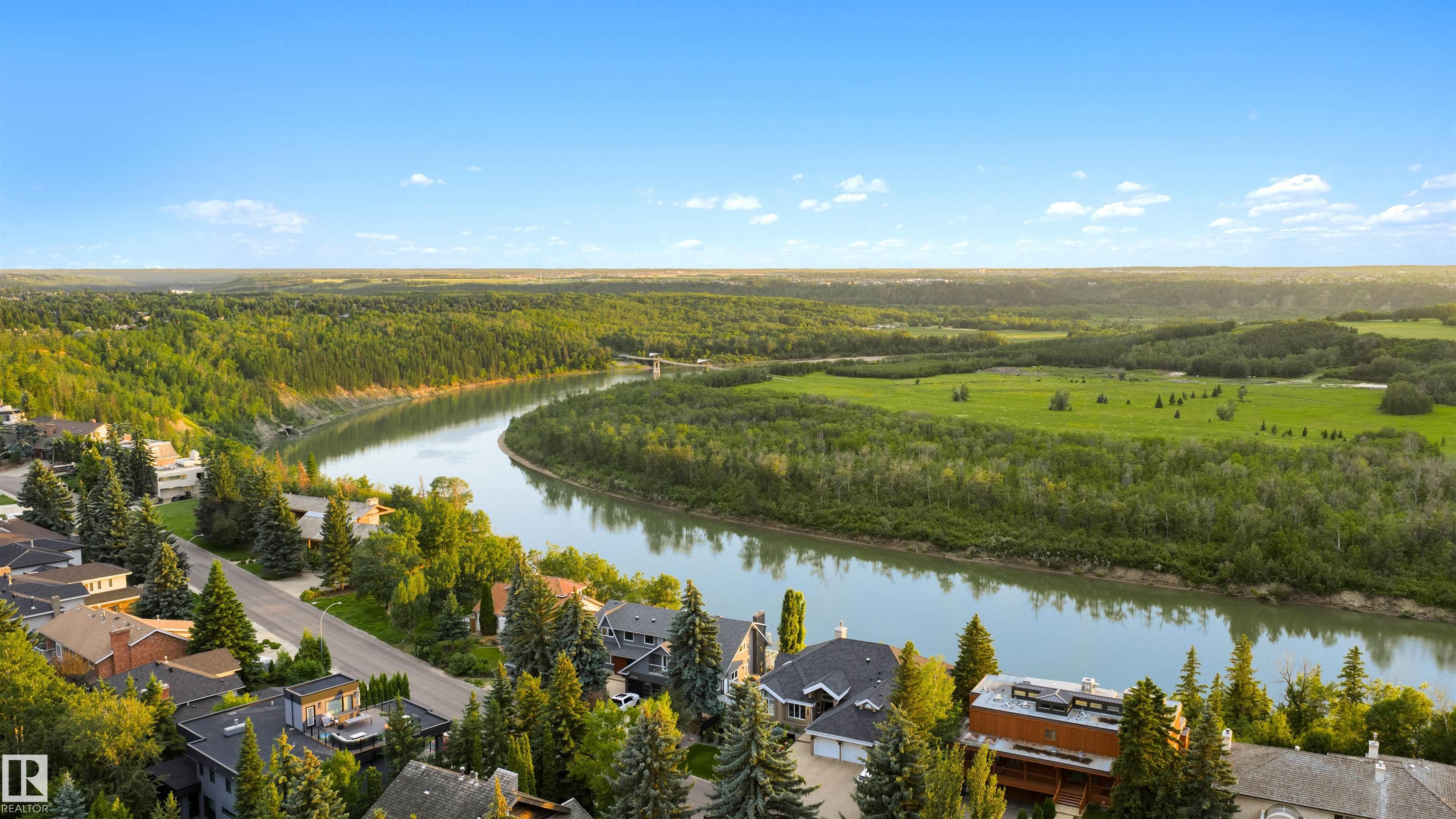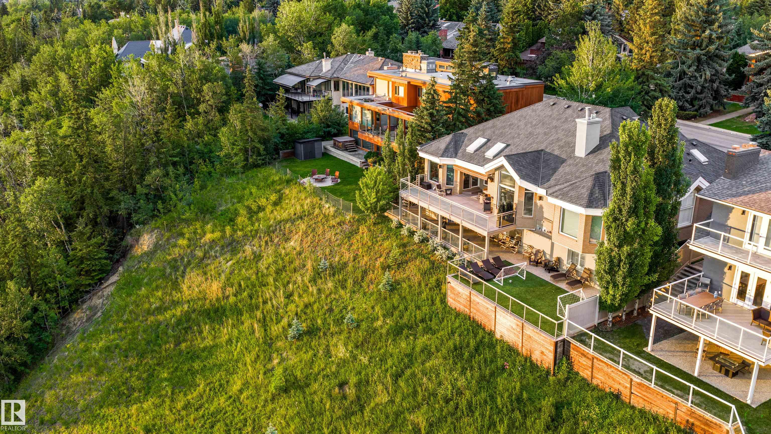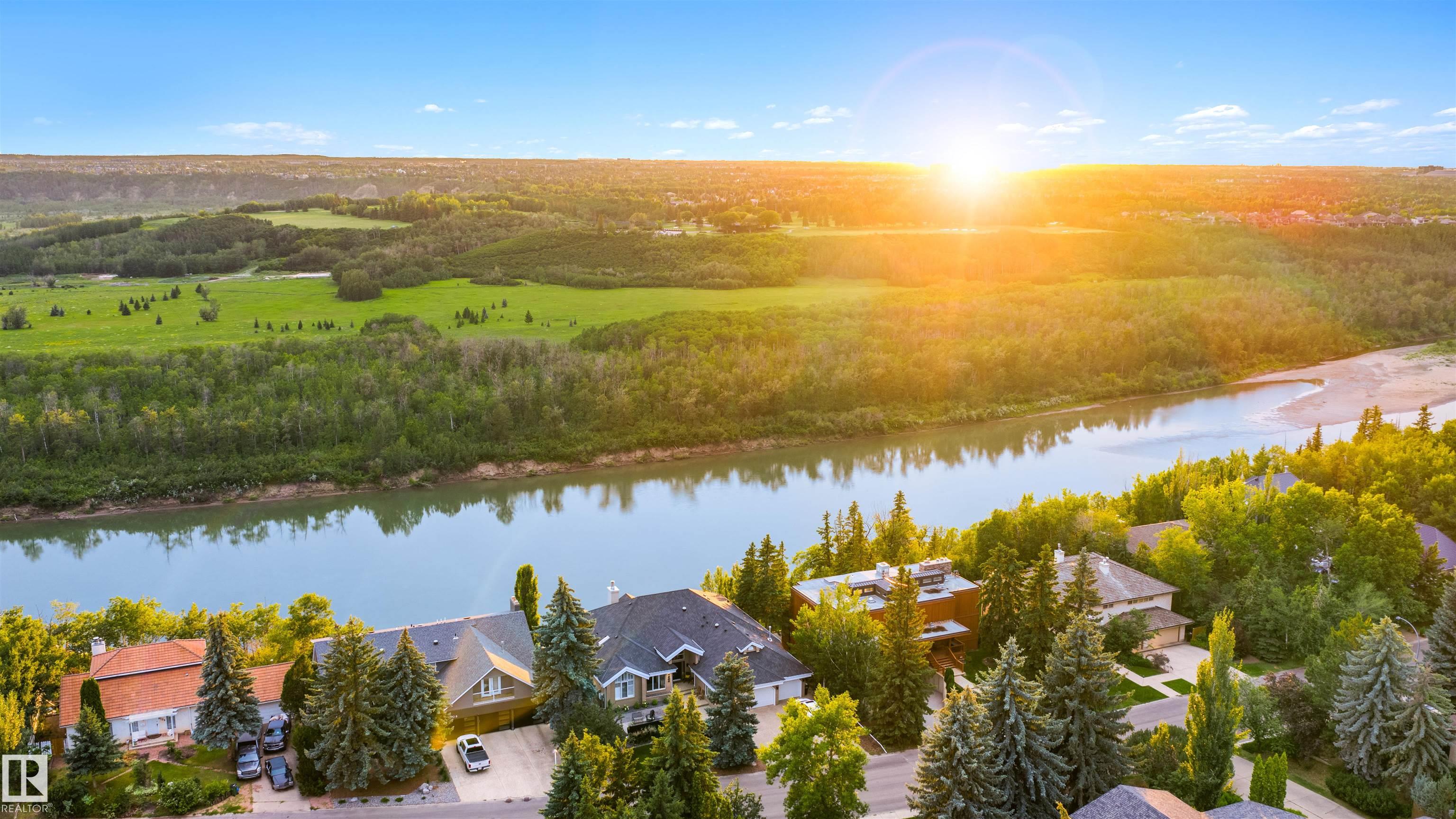 Designed for the executive, this walkout bungalow blends timeless elegance with modern comfort in prestigious Ramsay Heights. Nestled along the North Saskatchewan River with a west-facing yard, this brick home offers sunset views and a tranquil connection to nature. Exterior highlights include composite decking, exposed aggregate driveway and covered lower patio, artificial turf, and a private three-hole putting green. Inside, the custom kitchen features double islands, each with eat-up bars, double ovens, and a walk-in pantry, flowing into a spacious living area ideal for entertaining. The home offers two plus two bedrooms and four full baths, including a luxurious five-piece ensuite with a dream walk-in dressing room closet. Laundry on both levels adds convenience, and the triple attached garage provides direct interior access. A rare opportunity to live on the bank of Edmonton's most iconic riverfront settings.