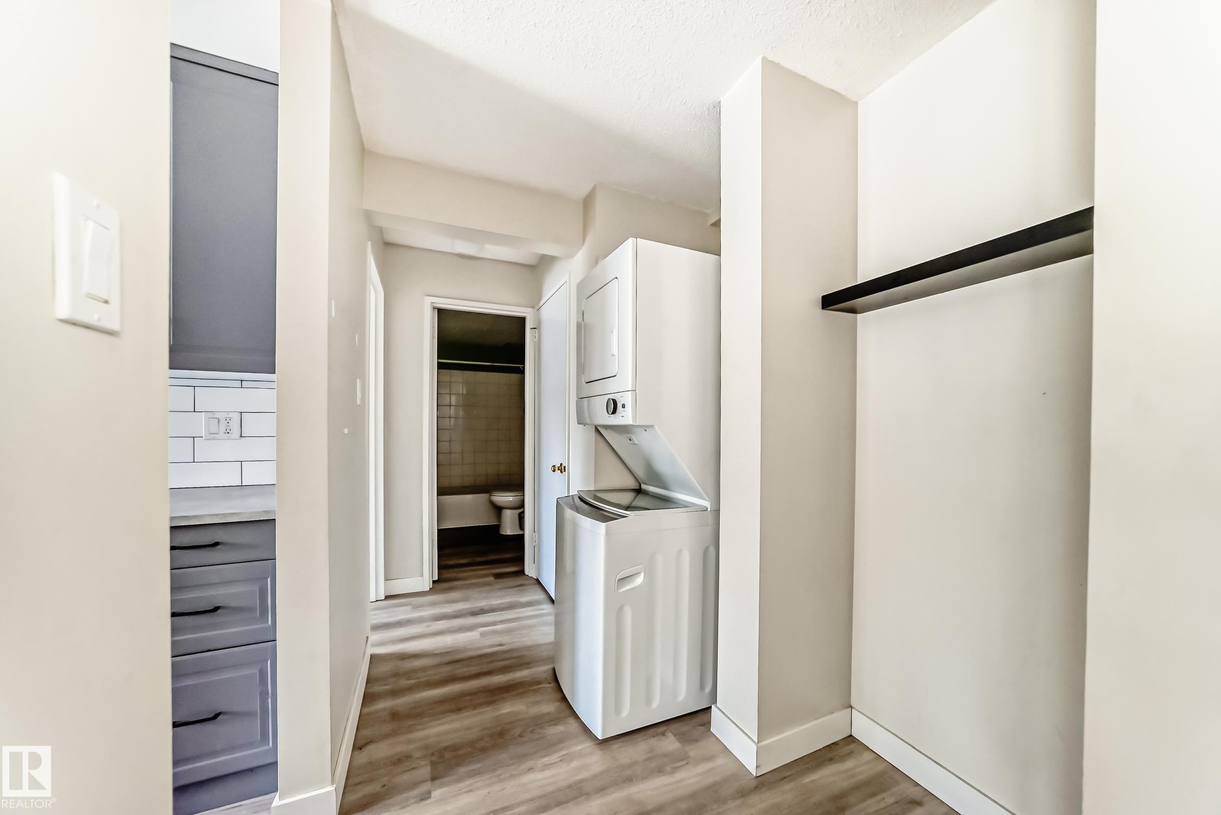 One Bedroom and one bathroom unit in sought-after Royal Gardens! This updated 701 sq. ft. condo offers privacy and natural light with an open layout. Bright windows fill the open-concept living and dining area, and the galley kitchen features modern cabinetry with stainless steel appliances. The entire unit has newer vinyl flooring and features a newer washer/dryer combo for in-suite laundry. Patio doors lead to a private balcony with open views of the peaceful courtyard and walking path. Enjoy in-suite laundry, oversized storage, in a well-managed, pet-friendly building with condo fees including heat and water, along with an in-complex exercise facility. Prime location close to the University, LRT, Southgate Mall, shopping, schools, daycares, and Whitemud Drive. Ideal for professionals, students, or investors.