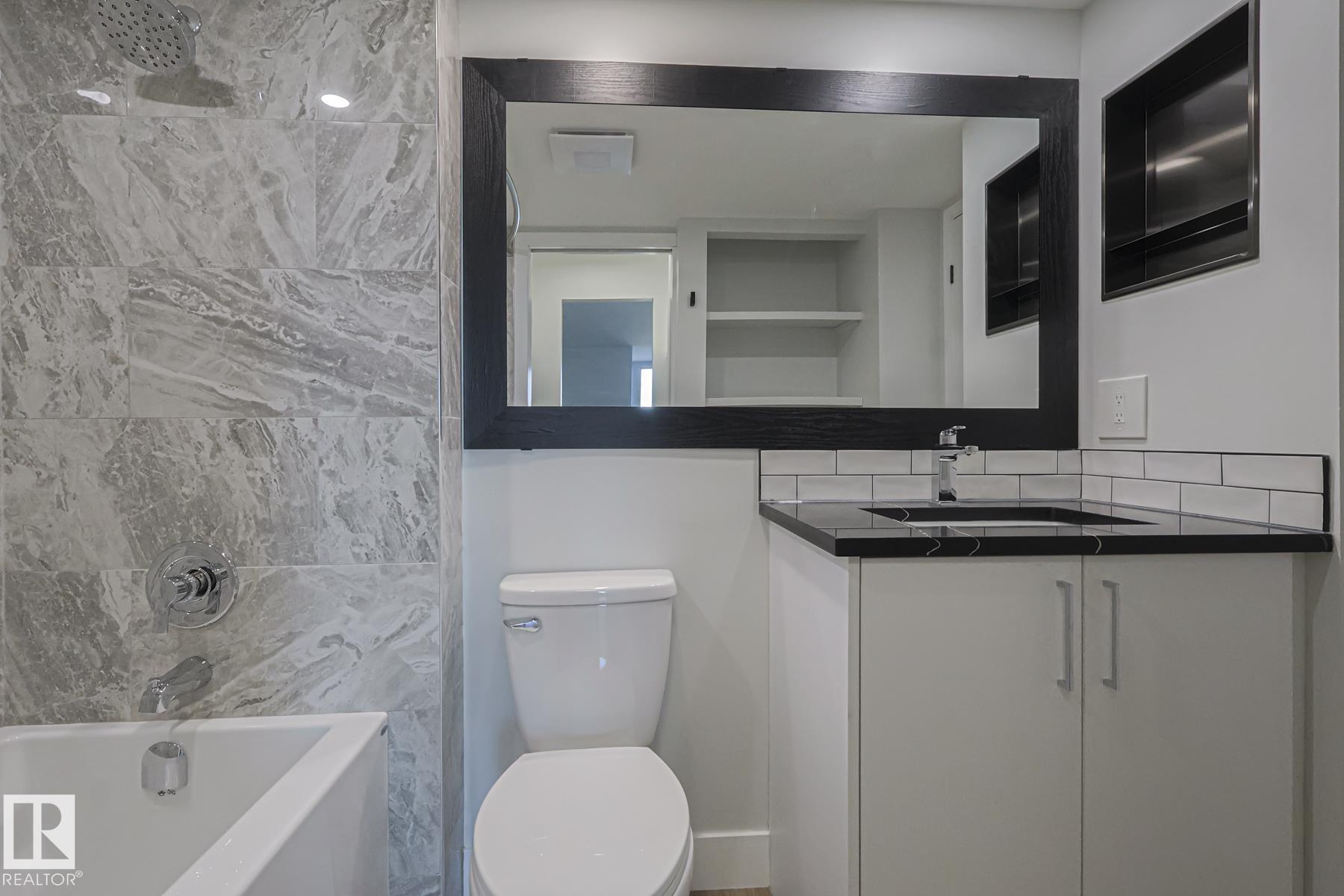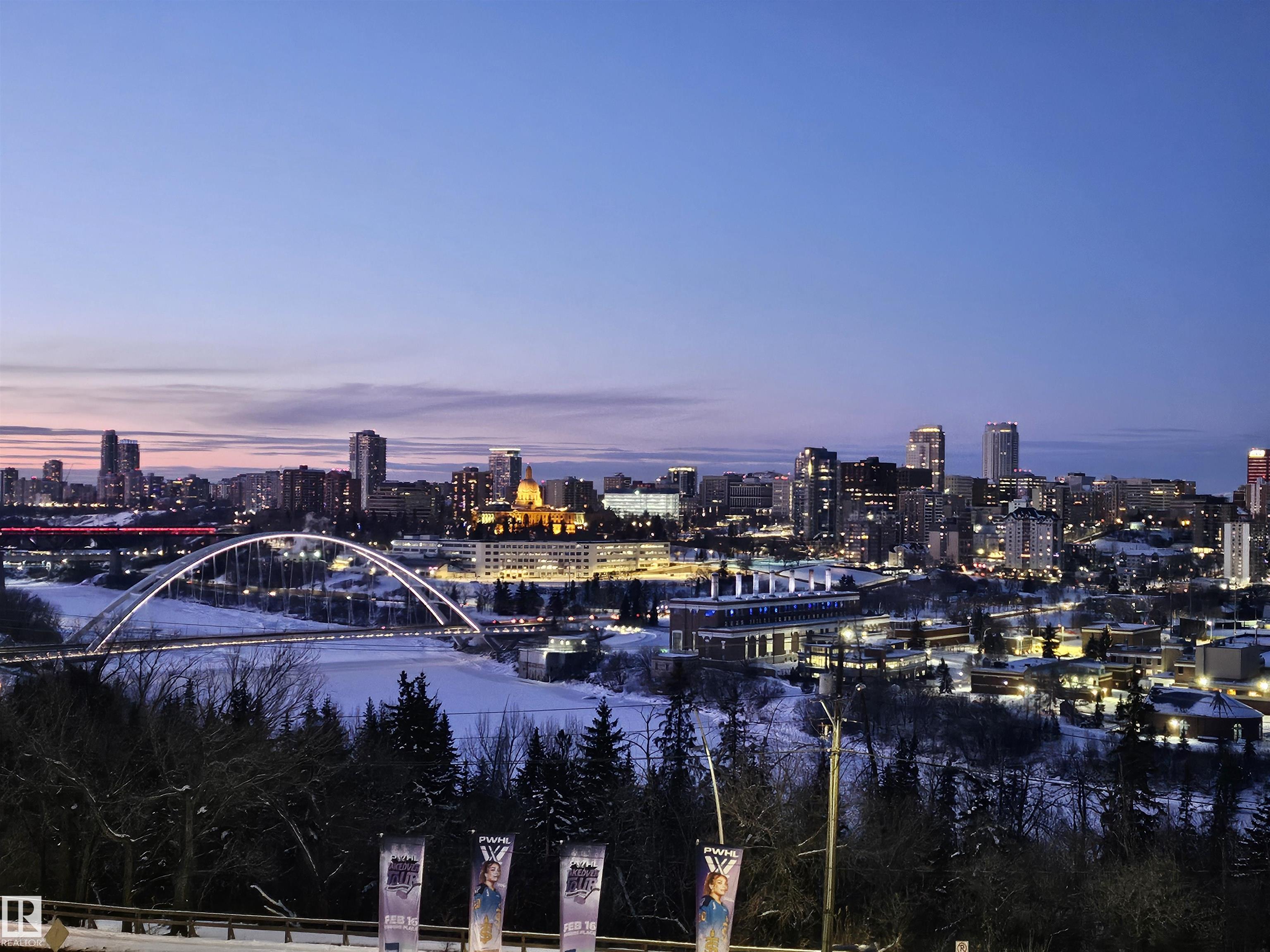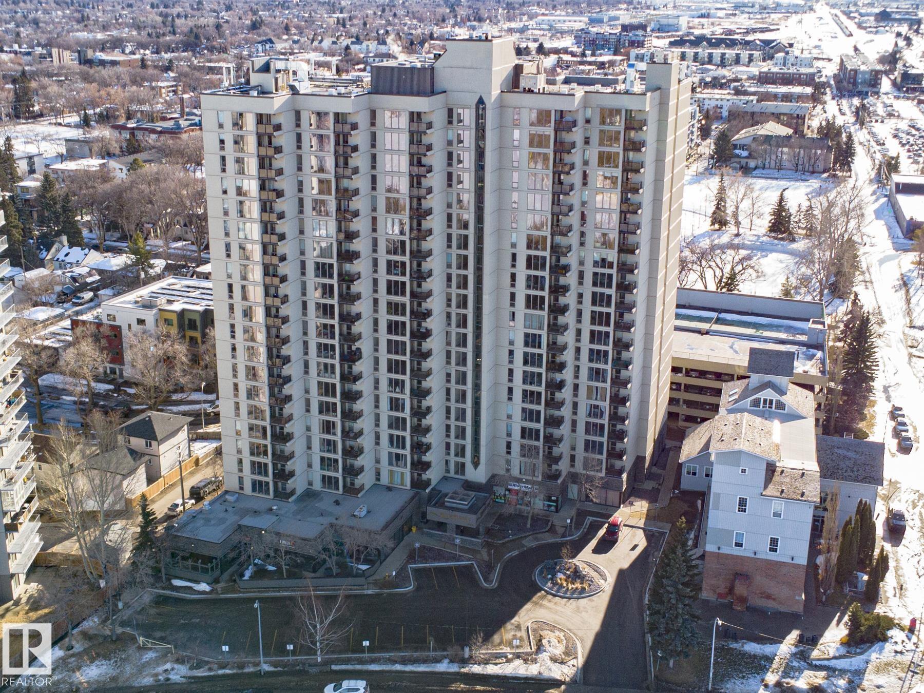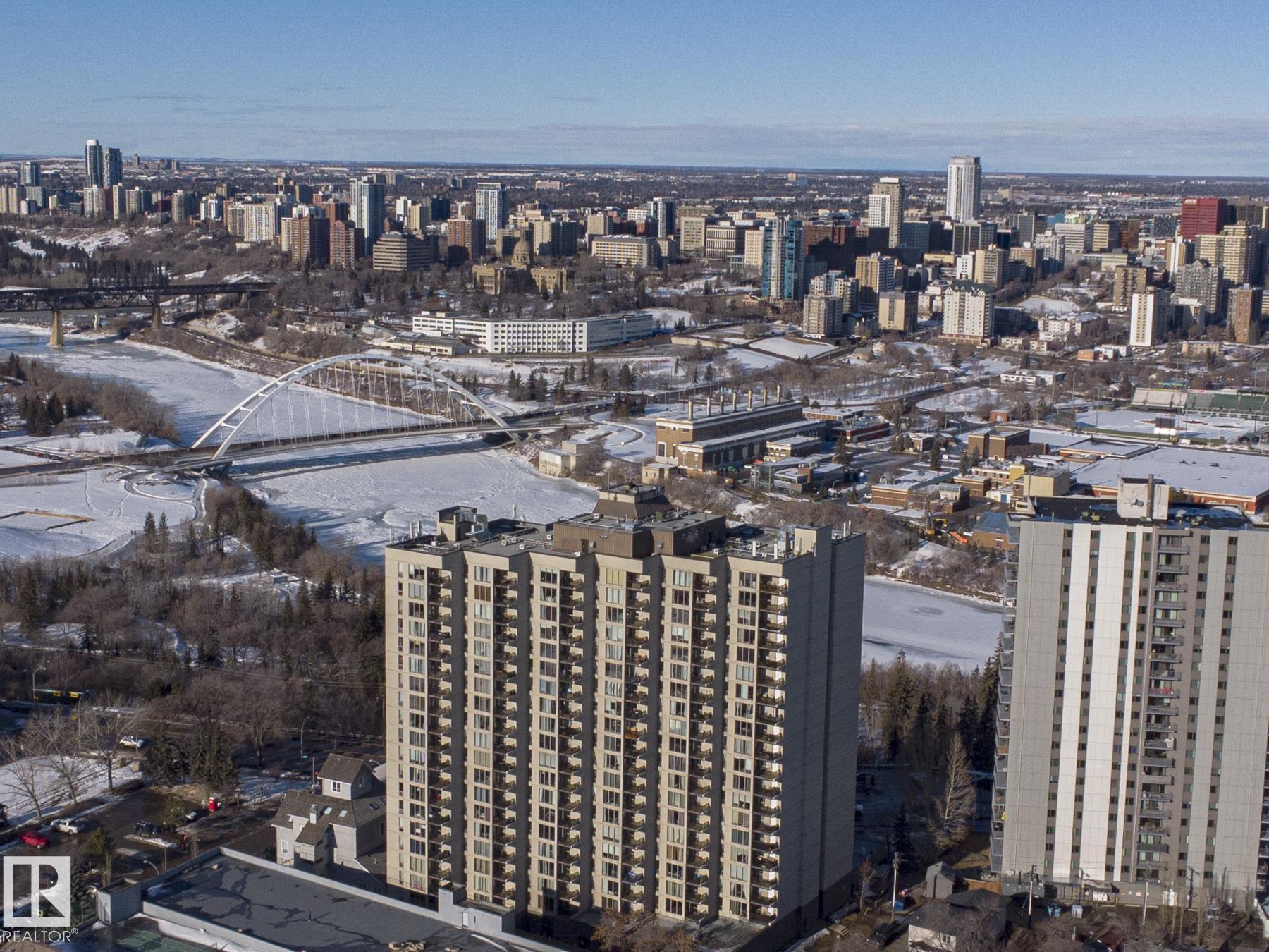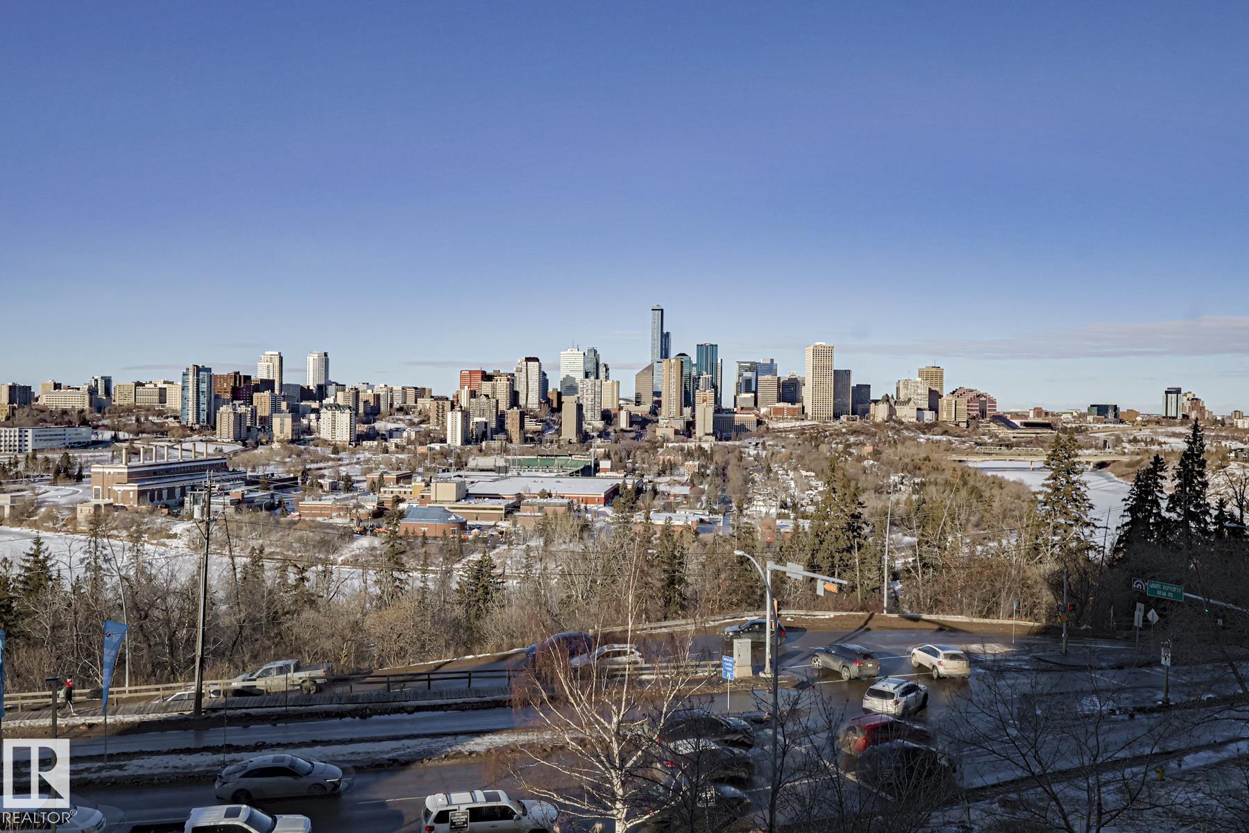 Brand Spanking New! This 1,000 sqft concrete high-rise unit offers 2 beds/2 Ensuite baths, fully renovated to a luxury level w/ breathtaking views of river valley and city skyline, perfectly blending urban convenience w/ natural beauty, Ideally located near Downtown & University, with easy access to trails, vibrant bars, restaurants, and shops of Whyte Avenue. You're greeted by warm vinyl plank flooring throughout; Timeless black & white kitchen featuring sleek white cabinetry, stainless steel appliances, and quartz countertops--sure to ignite your passion for cooking! Living room showcases panoramic views, while the primary bedroom features a private ensuite with Bathtub; the second ensuite offers a walk-in shower, giving you the best of both worlds. Both bathrooms are fully renovated with custom vanities, porcelain tile, undermount sinks & quartz countertops. Additional amenities include night-time security, gym, squash court, social room, parkade w/ basketball & tennis court on top! Exceptional Value!