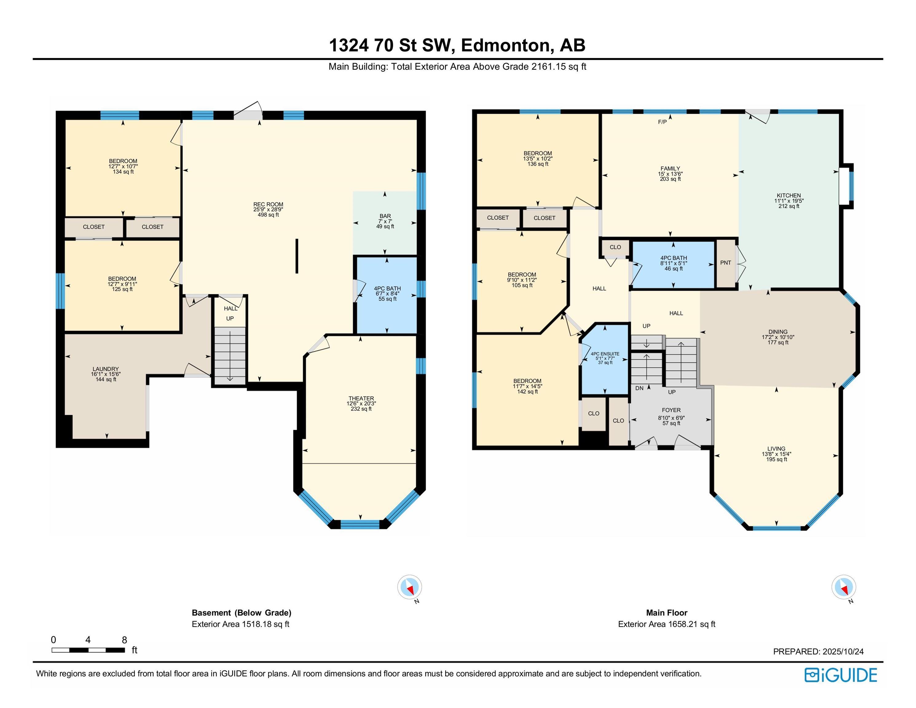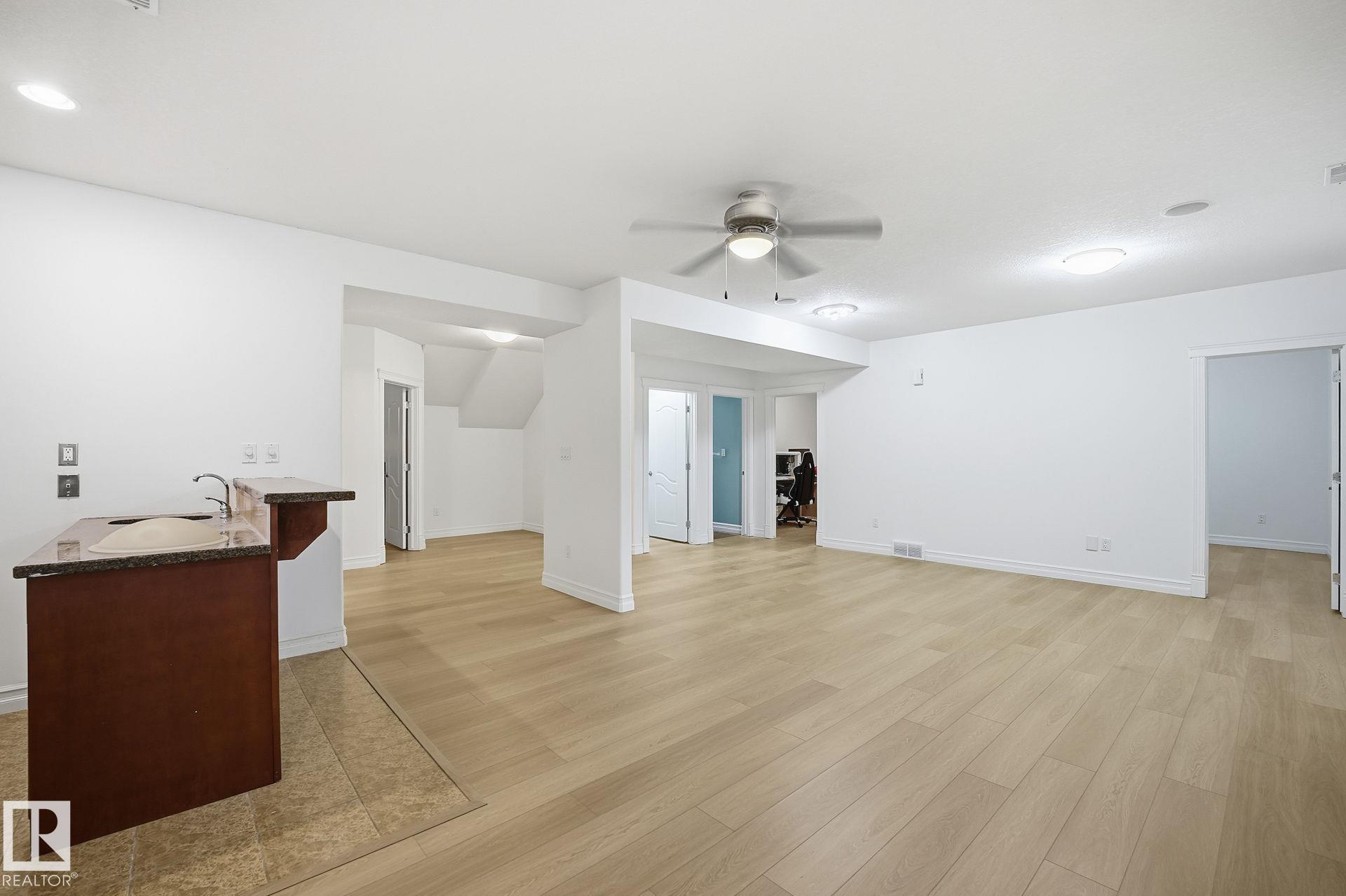 Walk in, walk out, but don't walk away. Welcome to 1324 70 St SW in Summerside, offering over 3,600 sq ft of total living space where comfort meets quiet luxury. From the moment you pull into the triple car garage and step inside, you'll feel the openness this custom 2.5 bi level walkout provides. Set on the largest lot in its cul-de-sac, this home offers space, parking, and easy access. Sunlight fills the vaulted living room, where warm hardwood and a gas fireplace create a cozy retreat. The main floor features 4 spacious bedrooms and 3 full baths, incl. 2 ensuites. Up a few quiet steps, the master retreat enjoys a floor of its own, offering calm and seclusion after long days. The walkout basement adds 2 bedrooms, a 4th full bath, laundry, a wet bar, and an acoustically treated theatre room complete w/ projector. Freshly painted, with refinished hardwood, laminate (2022), and new LVP under warranty until 2026. Close to schools, parks, the airport, and highways, this home is perfect for all stages of life