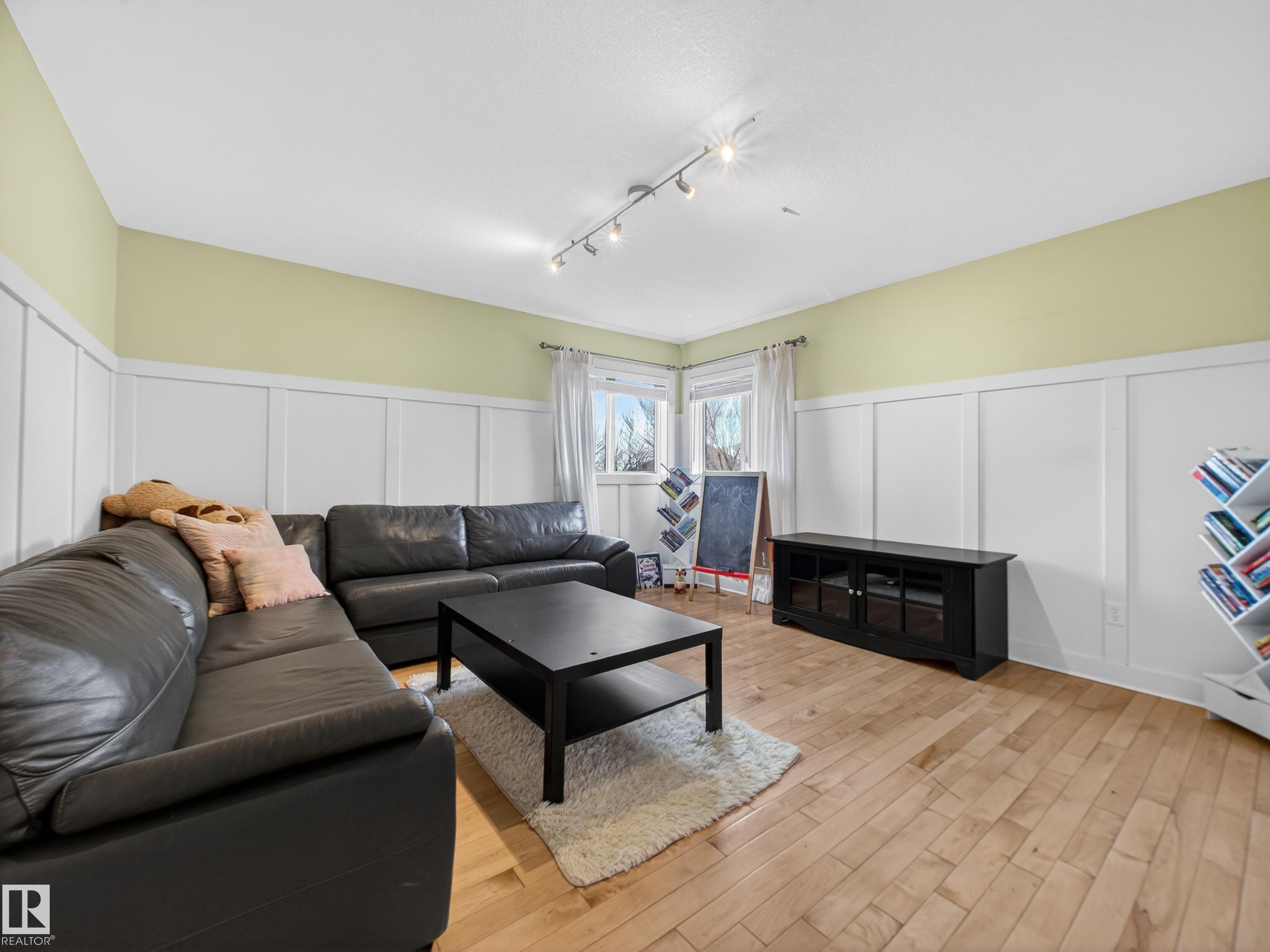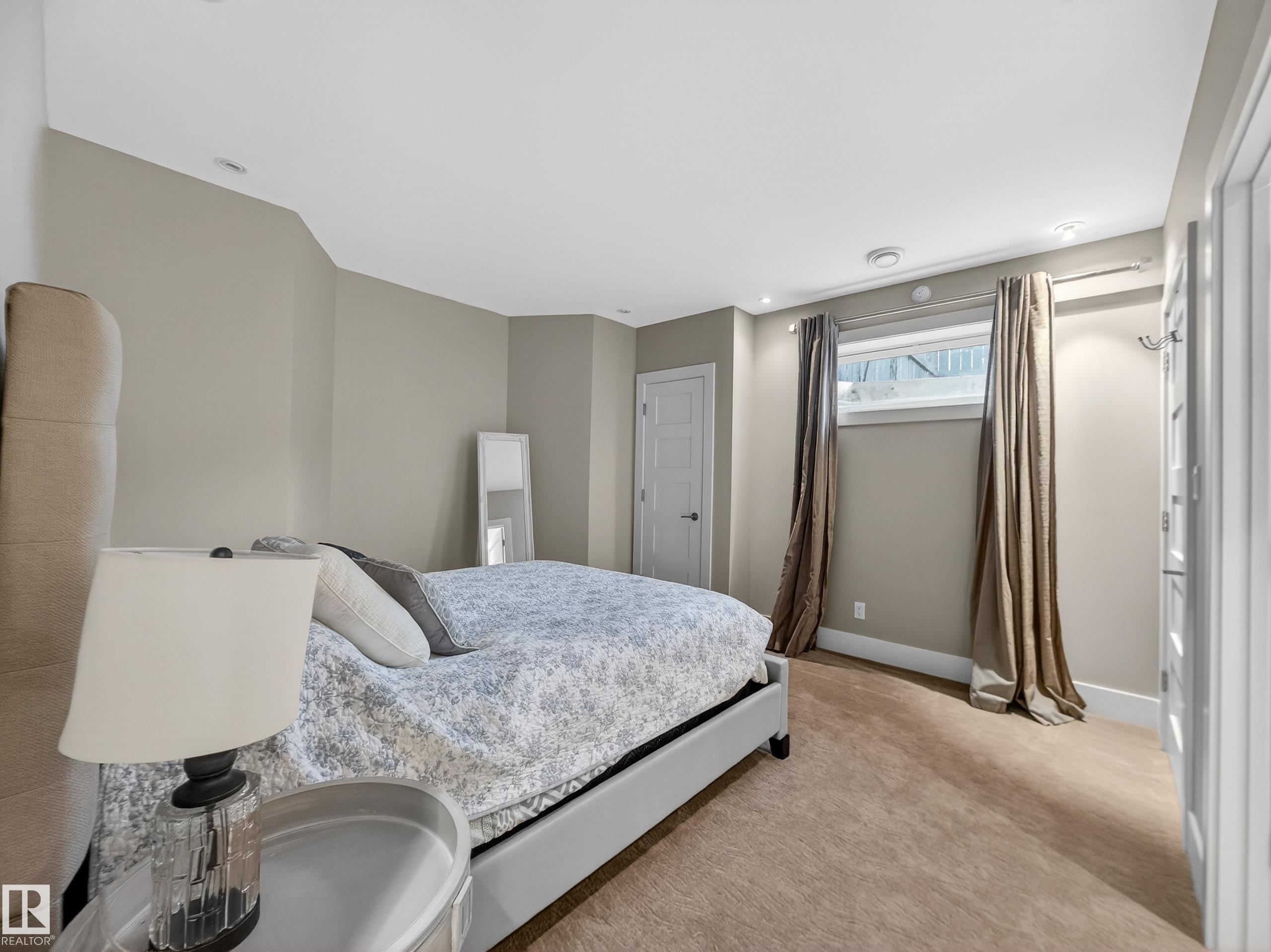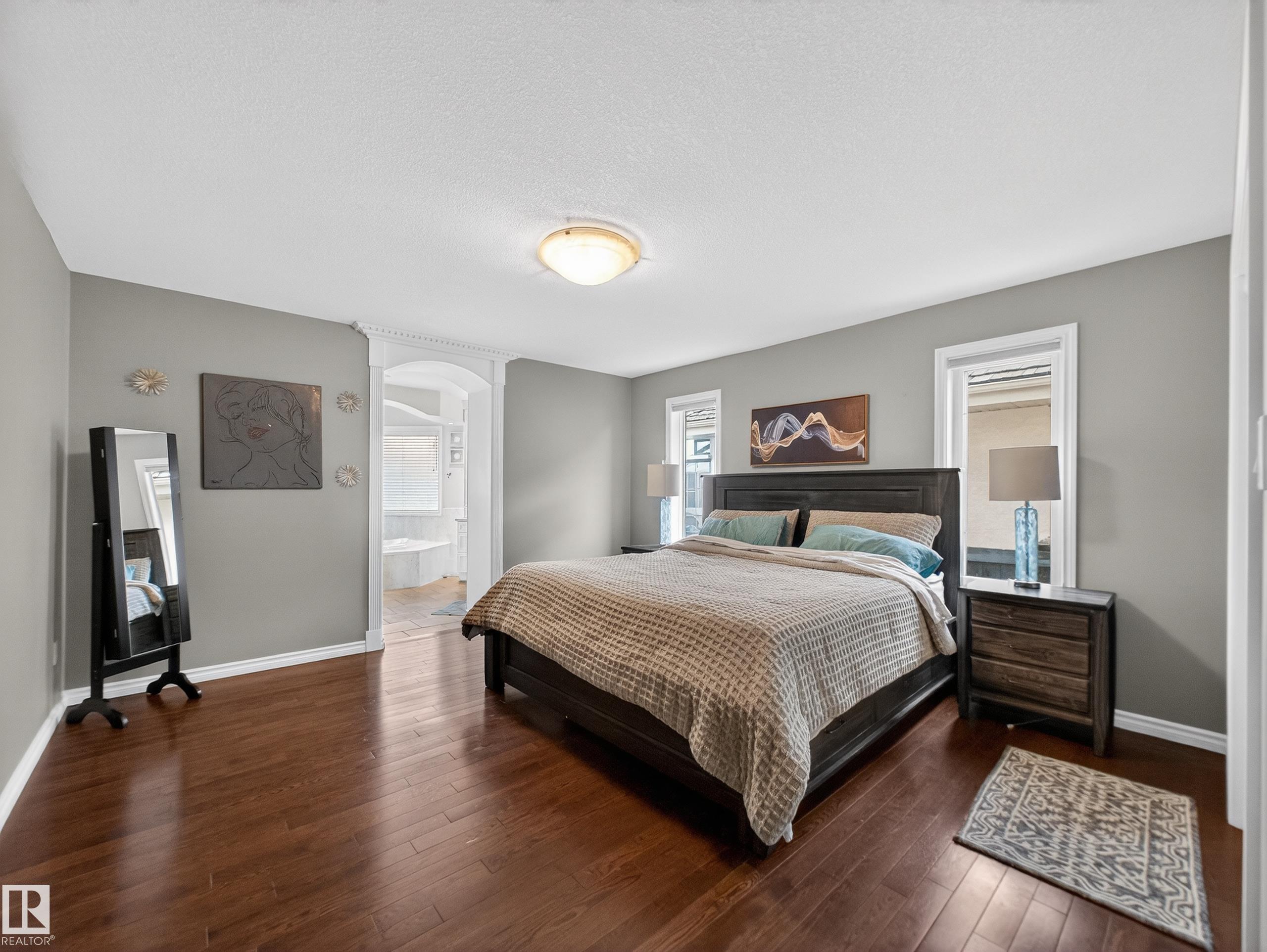 Elegant 5-bedroom Carriage Custom-built home in the sought-after community of Terwillegar Gardens. The main floor features an inviting foyer, a bright living room with vaulted ceilings, expansive windows, gas fireplace, and chandelier. The kitchen offers quartz countertops, modern cabinetry, stainless-steel appliances, and a corner pantry. A formal dining room is ideal for entertaining, while the rare main-floor primary suite includes a walk-in closet and spa-inspired 5-piece ensuite. Upstairs are three large bedrooms, a 5-piece bath, and a den with built-in cabinetry. The finished basement adds a fifth bedroom, gym, 3-piece bath, kitchenette, laundry/storage area, and a spacious family room with gas fireplace. Recent upgrades include two furnaces, two A/C units, and two humidifiers. Located on a large corner lot with a maintenance-free deck, concrete patio with firepit, and artificial turf. A refined family home in a premier location.