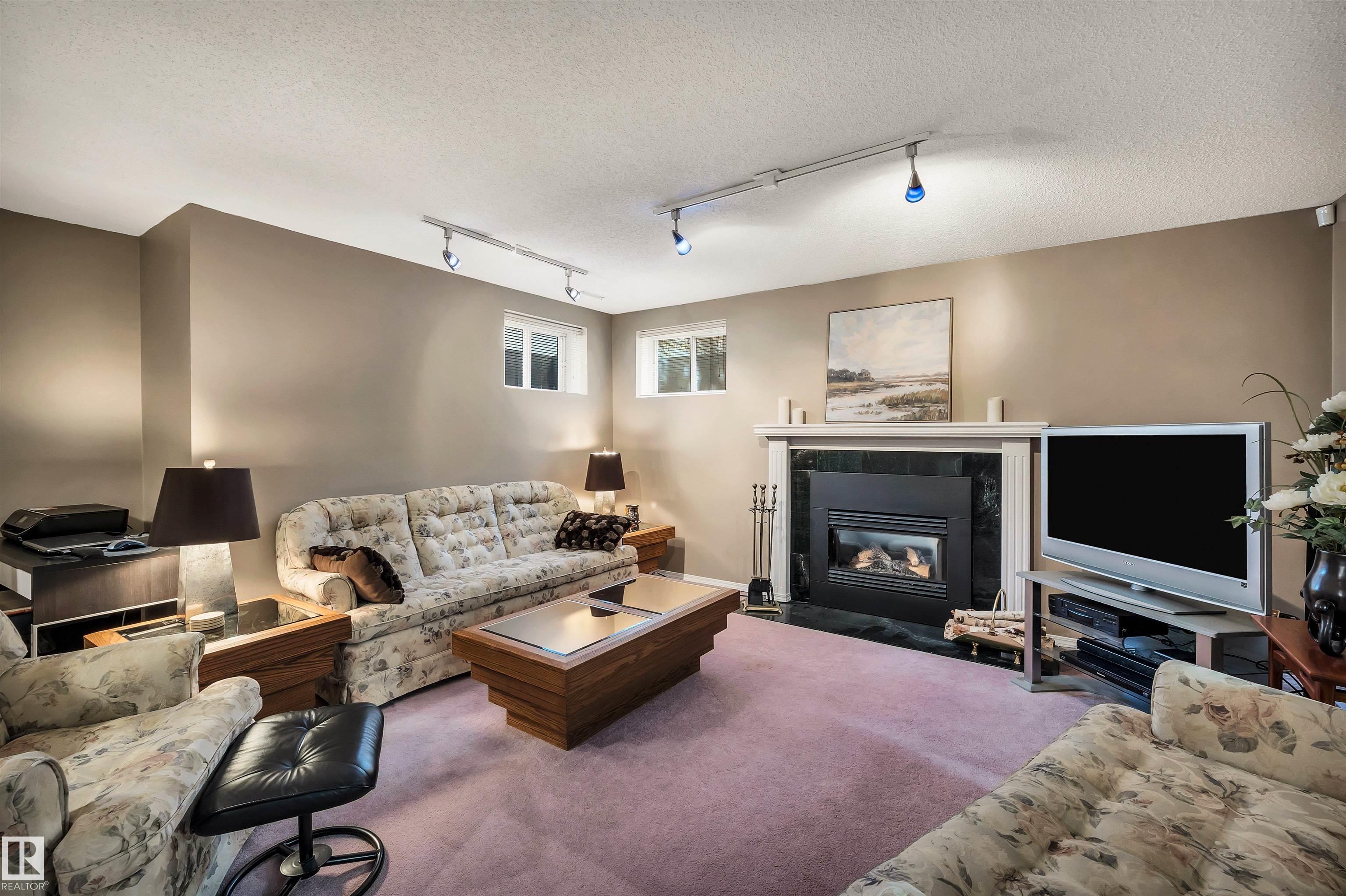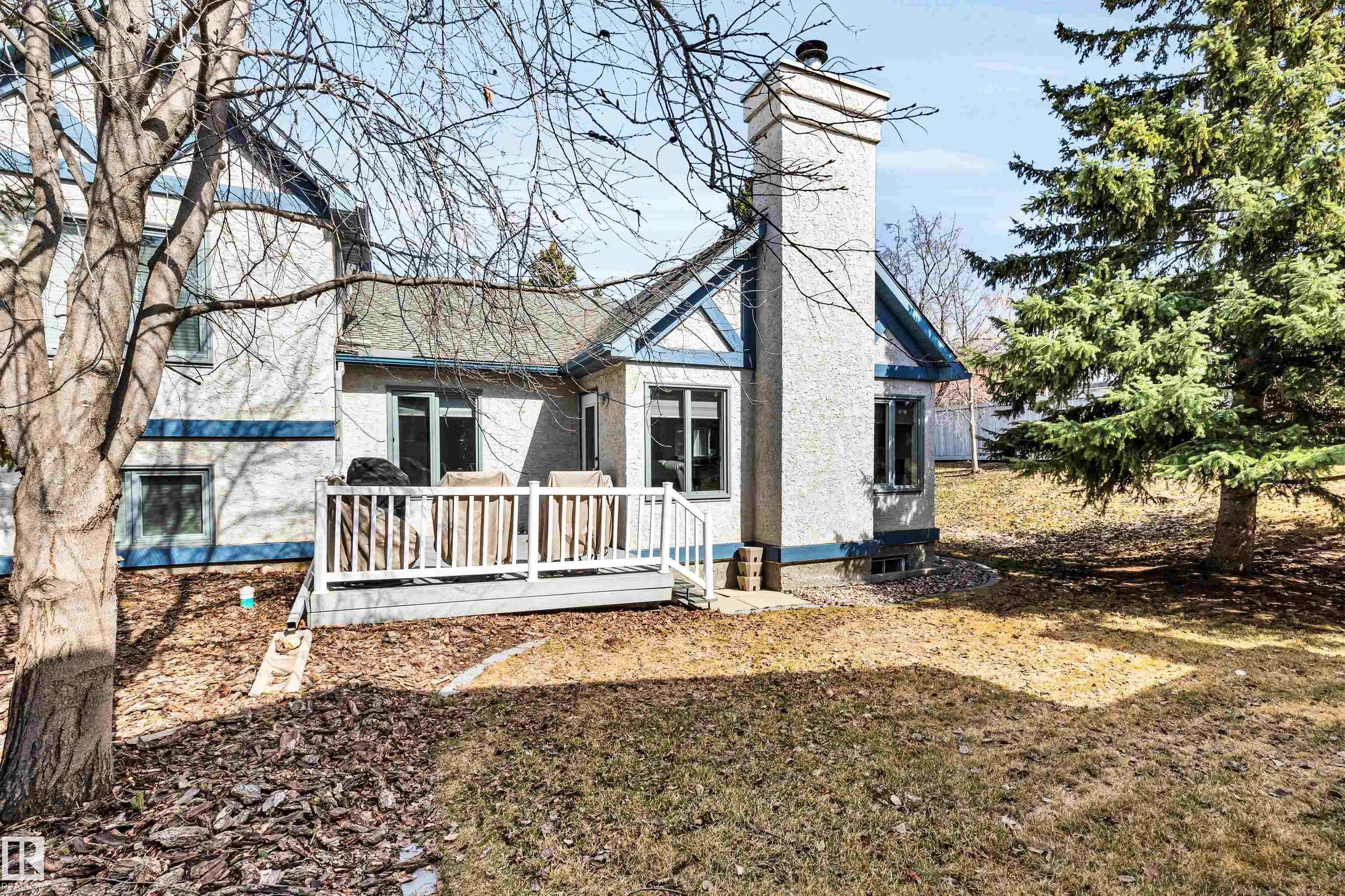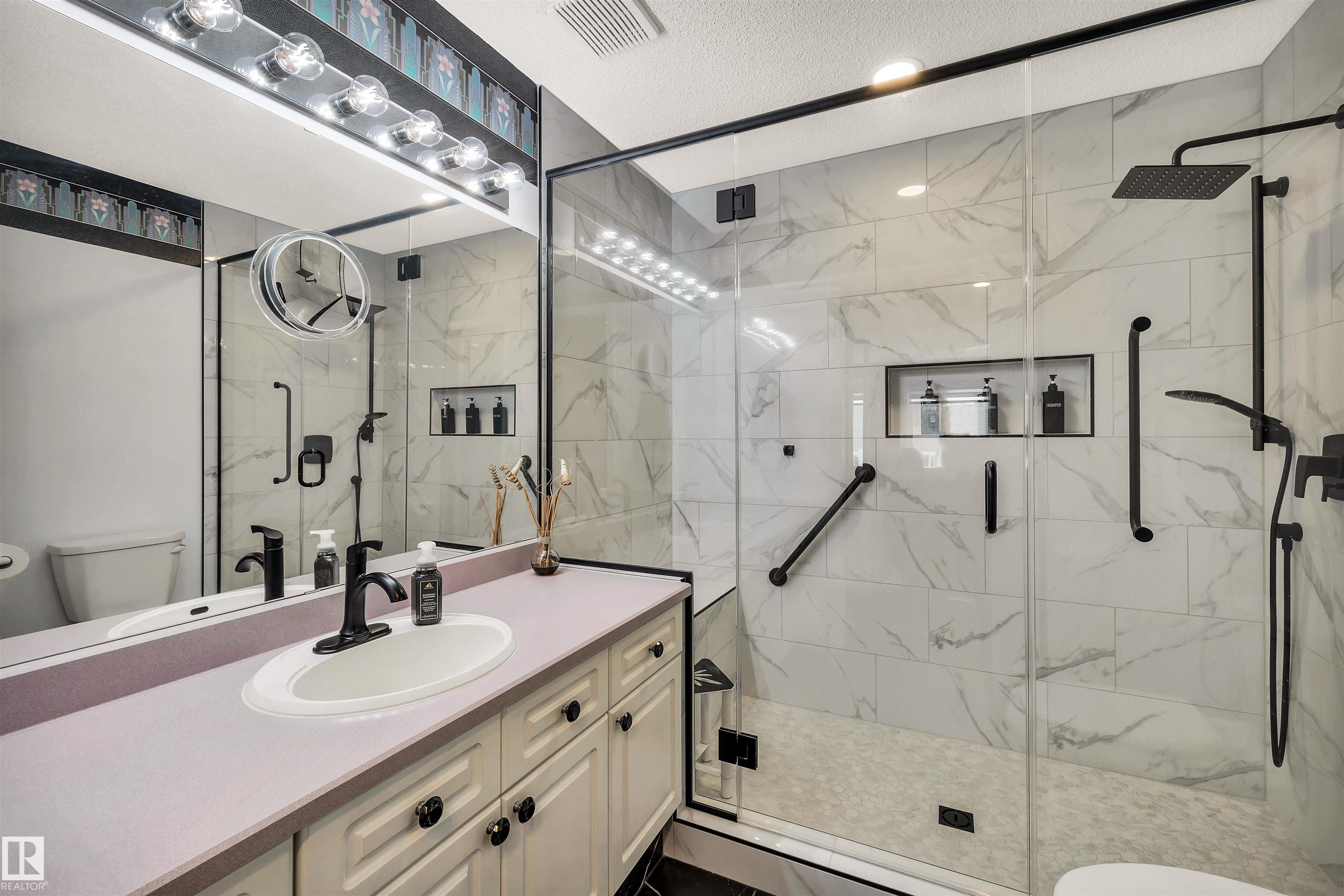Welcome to this beautifully maintained bungalow in the exclusive Twin Brooks Classics, a sought-after 16+ adult living community. Thoughtfully updated, this home offers an open-concept main floor ideal for comfortable living & entertaining. The timeless white kitchen features dual pantries & flows seamlessly into the main living space. Enjoy the ease of main floor laundry & newer vinyl windows w/custom blinds. The spacious primary includes mirrored closets & renovated spa-inspired ensuite w/heated floors & tiled walk-in shower w/bench. The fully finished basement adds a third bedroom, full bath, large rec room w/pool table, gas fireplace & ample storage. Relax outdoors on the composite deck w/gas BBQ hookup. Complete w/retractable screens on both front/back doors, A/C & double attached garage. Newer furnace & HWT. Located on the MacTaggart Sanctuary & Whitemud Creek Ravine w/extensive walking trails, outdoor skating rink, community league building/garden & more! Close to shopping & all amenities. A gem!