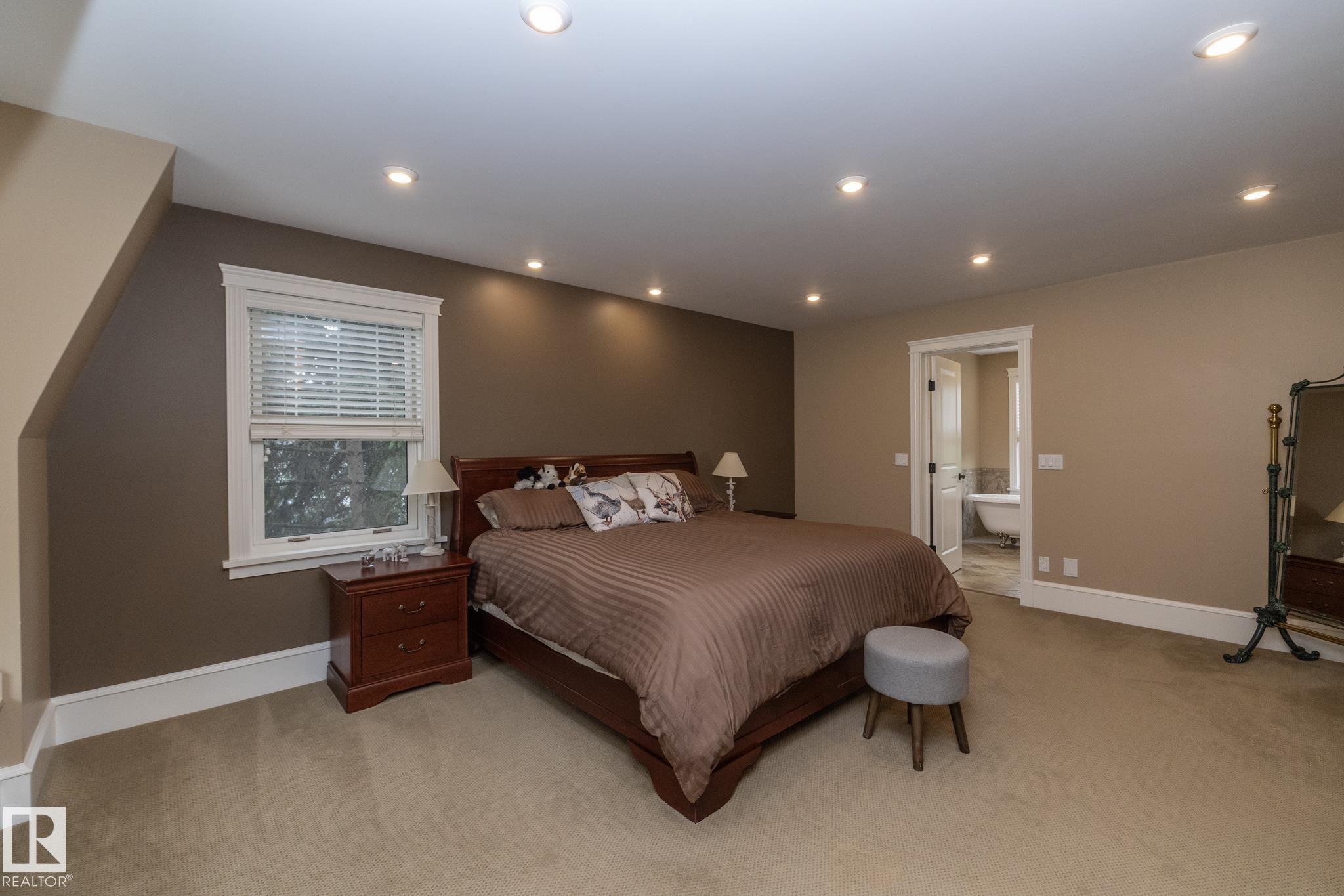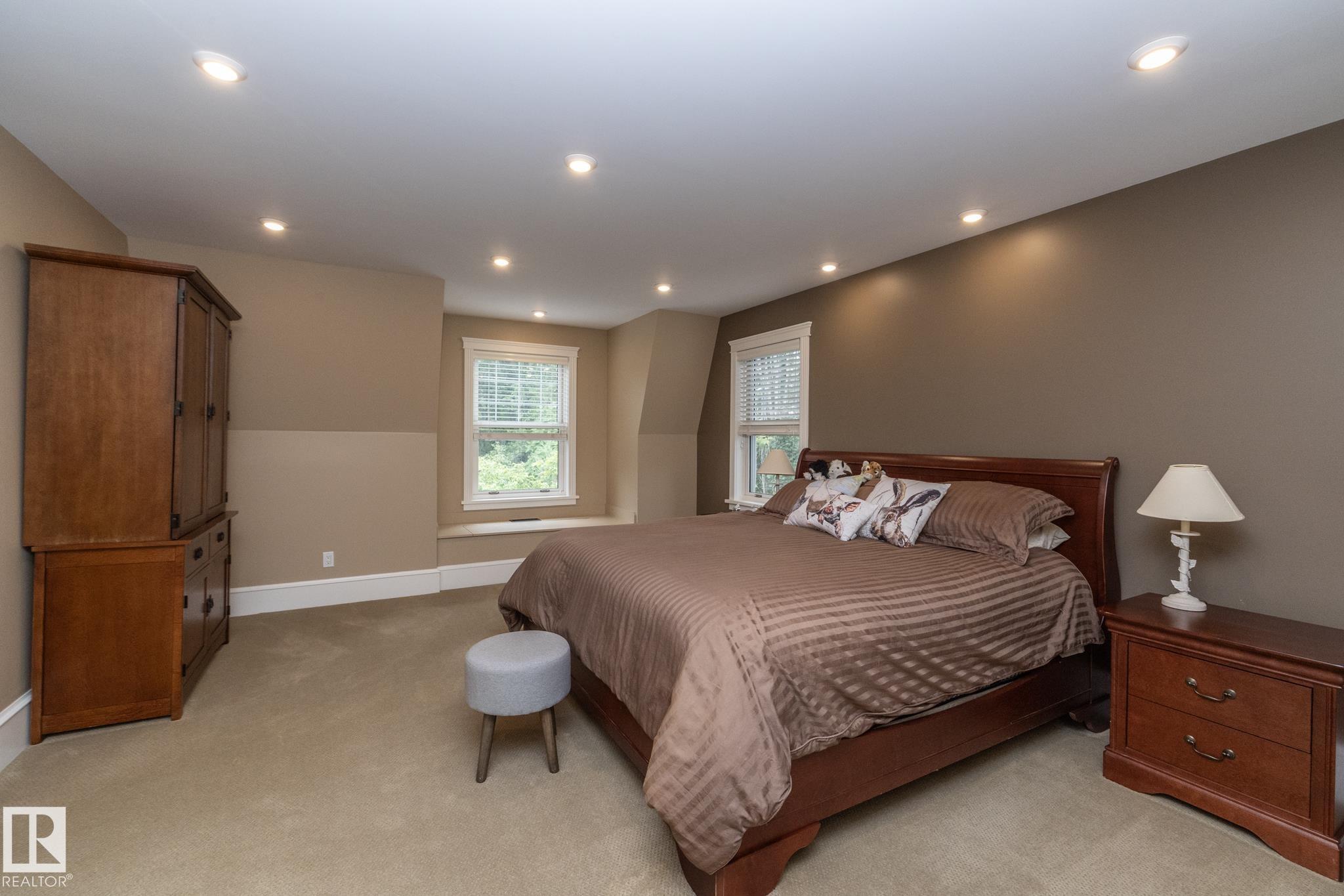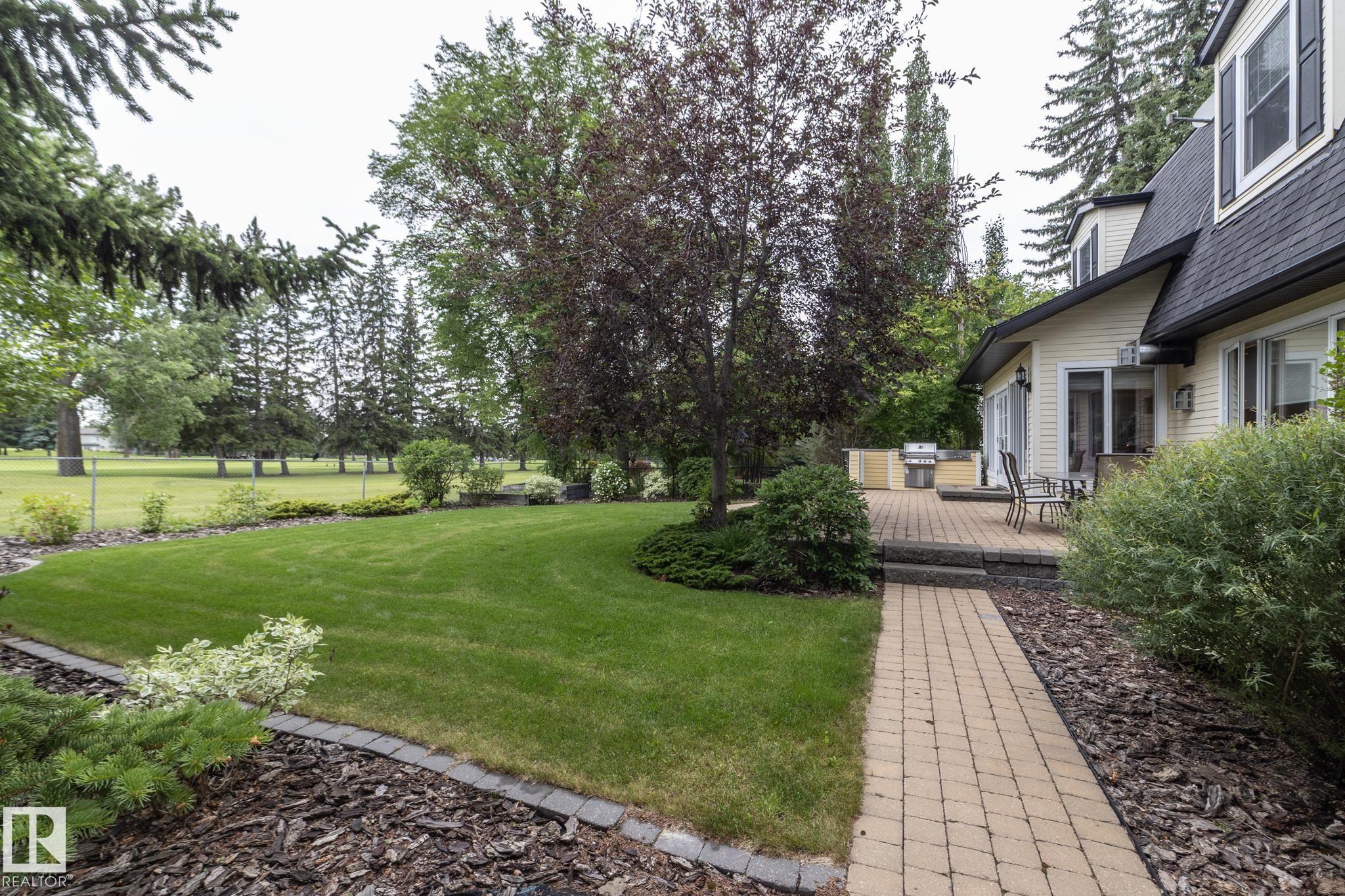 OWN A PIECE OF HISTORY ON FAIRWAY DRIVE! Backing directly onto hole #6 of the Derrick Golf & Winter Club, this 3,562 sqft masterpiece (built 1967, expanded 2005, renovated 2009) fuses timeless craftsmanship w/ modern luxury. A sun-splashed open plan showcases hardwood, marble tile, crown mouldings, wainscoting, LED pots & built-in speakers framing a true chef's kitchen w/ granite counters, two-tone island & pro-grade appliances. Unwind beside the classic wood-burning hearth or the sleek electric FP. Two lavish primary suites, one on the main, one upstairs, offer spa-inspired baths (claw-foot & Jacuzzi tubs). Plus two more bedrooms: one upstairs & one in the finished bsmt, for a total of four, all served by five elegant baths. Dual laundry rooms add everyday ease. Outside, a stone patio w/ built-in BBQ overlooks the meticulously landscaped, irrigated yard. Hardie-board exterior, oversized heated garage w/ sink & drain, BurBer carpet, two A/C units--move-in perfection on Edmonton's most prestigious street!